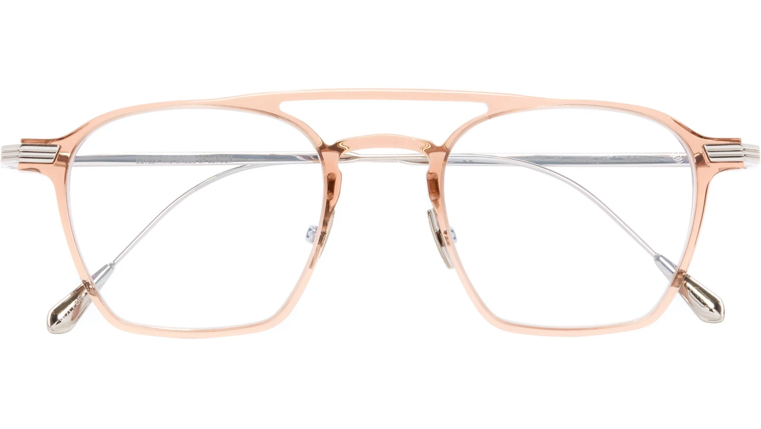 Cutler and Gross Aurum Metals 0009 04 glasses for men and woman, featuring peach / rhodium round acetate-metal frame and demo lenses. Cutler and Gross model 0009 optical glasses present a modern twist on the classic navigator frame. Crafted from polished acetate and ultra-light metal, this design features a distinctive raised double bridge and winged lugs for a unique silhouette. Additional specifications include teardrop temple tips and adjustable nose pads for enhanced comfort. The logo is elegantly engraved on the inner temple, highlighting the craftsmanship. These glasses belong to the Aurum precious metals collection and are meticulously handcrafted in Italy by skilled artisans. Brand line: Aurum Metals. Style code: 0009. Color code: 04. Authorized Cutler and Gross online reseller. Your glasses will include the original case and accessories and are covered by a 12-month global warranty.