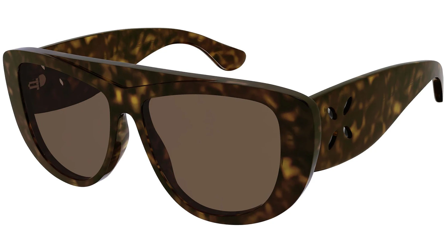 Azzedine Alaïa AA0056S 002 sunglasses with shiny dark havana frame and solid brown lens. Since its founding, the Parisian atelier of Azzedine Alaïa has maintained a reputation for its originality and unique quality of design. The unique sculptural approach and meticulous craftsmanship of Azzedine Alaïa is again brought forward in the sophisticated and feminine frames of this newest eyewear collection.