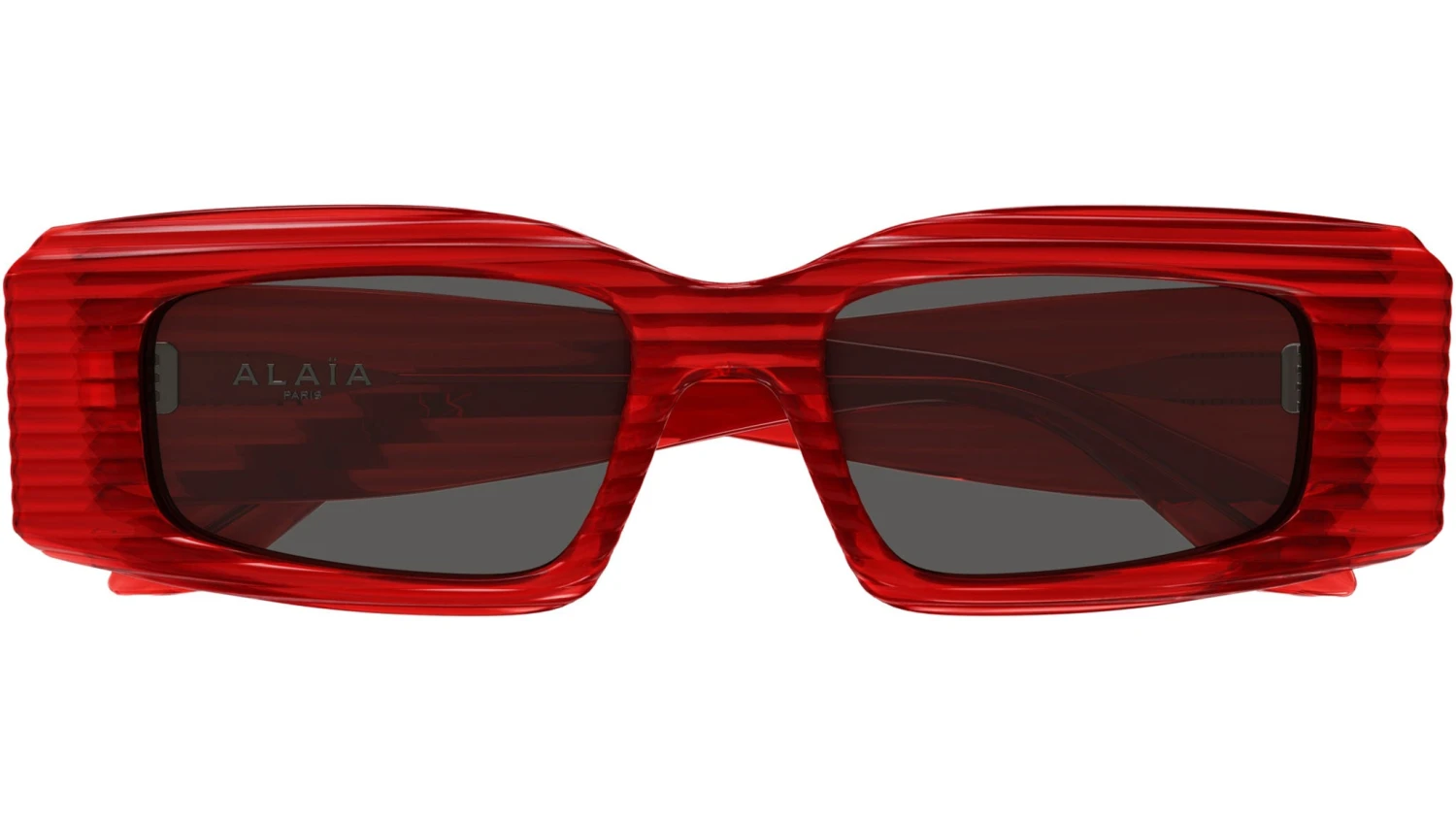 Azzedine Alaïa AA0078S 008 sunglasses for women, featuring shiny transparent bright red with stripes geometric recycled acetate frame and solid smoke CR-39 lenses. Brand line: Lettering Logo. Style code: AA0078S. Color code: 008. Made in Italy. Authorized Alaïa online reseller. Your glasses will include the original case and accessories and are covered by a 12-month global warranty.