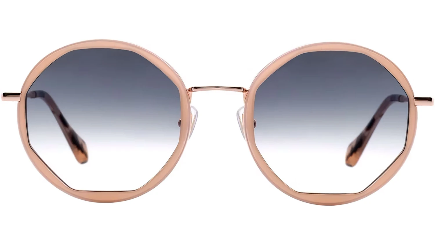 Gigi Studios Eyewar sunglasses model 6445 Alba color code 6 in rose gold. A classic geometric full rim acetate-metal glasses with blue gradient lenses. The brand ensures the highest quality through their meticulous selection of materials, partnering with top suppliers from Italy, Germany, and Japan. Gigi Studios provides an exceptional visual experience with CR-39 lenses that are comfortable and secure, effectively absorbing UVA and UVB rays.