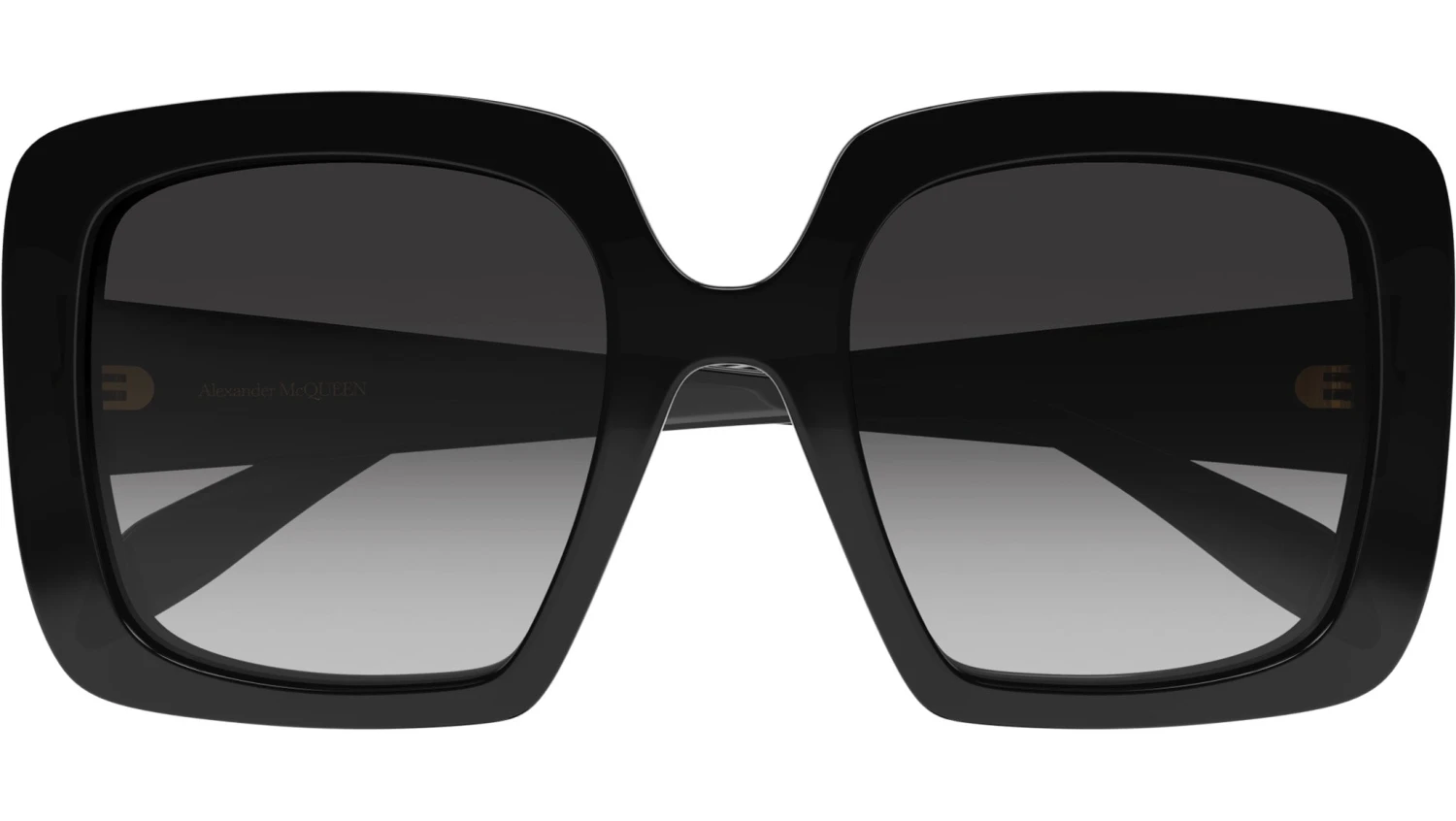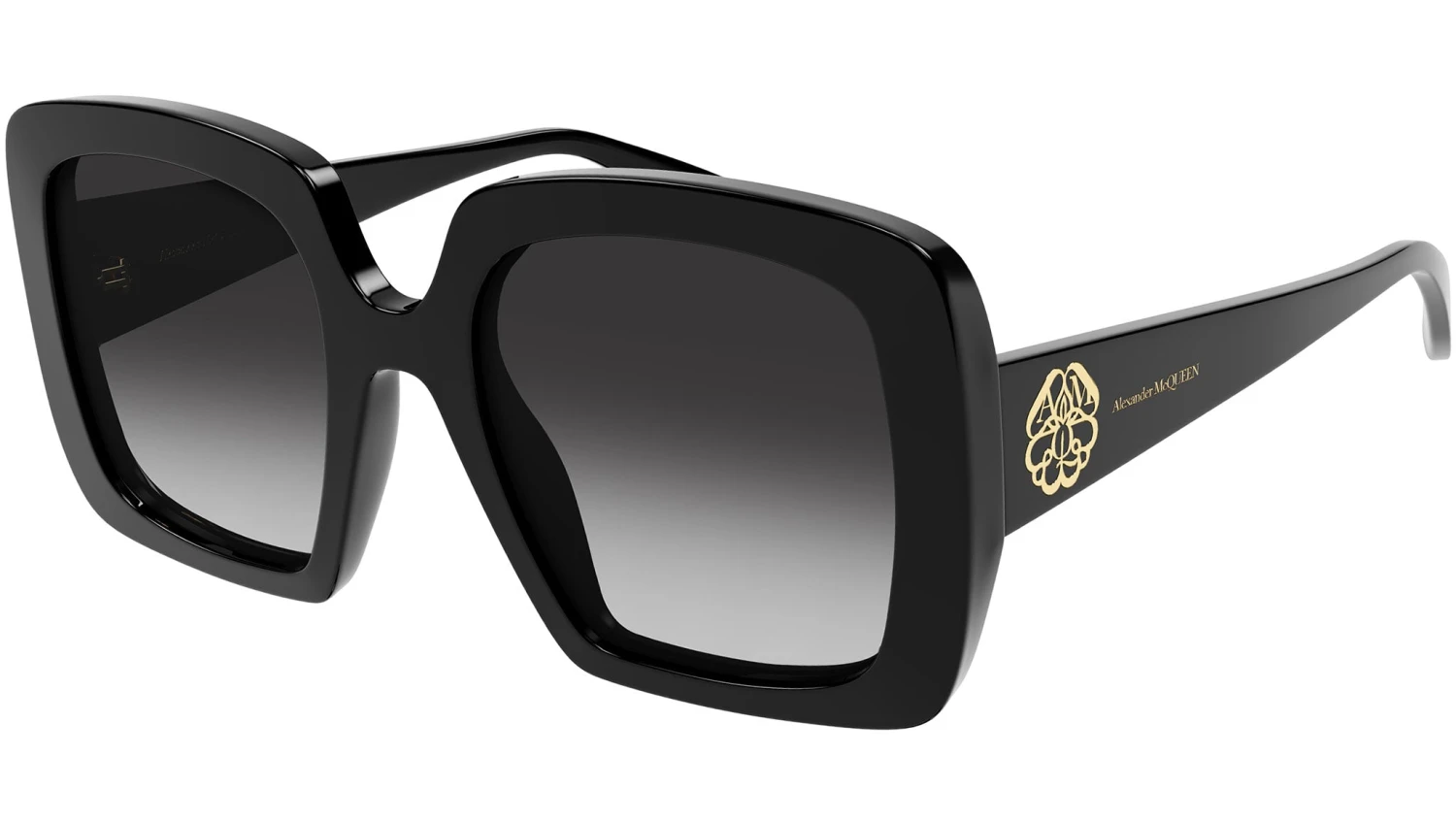 Alexander McQueen Icons collection sunglasses model AM0378S color code 001 featuring shiny black frame and gradient grey lens.