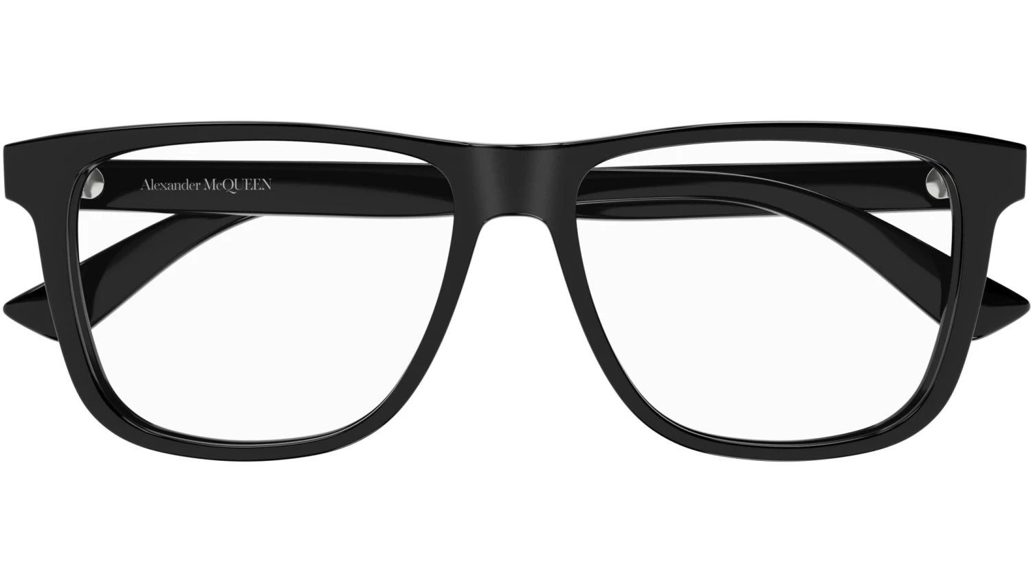 Alexander McQueen Casual Lines eyewear model AM0463O aviator recycled acetate glasses color code 001 shiny solid black with black temple and demo lens.