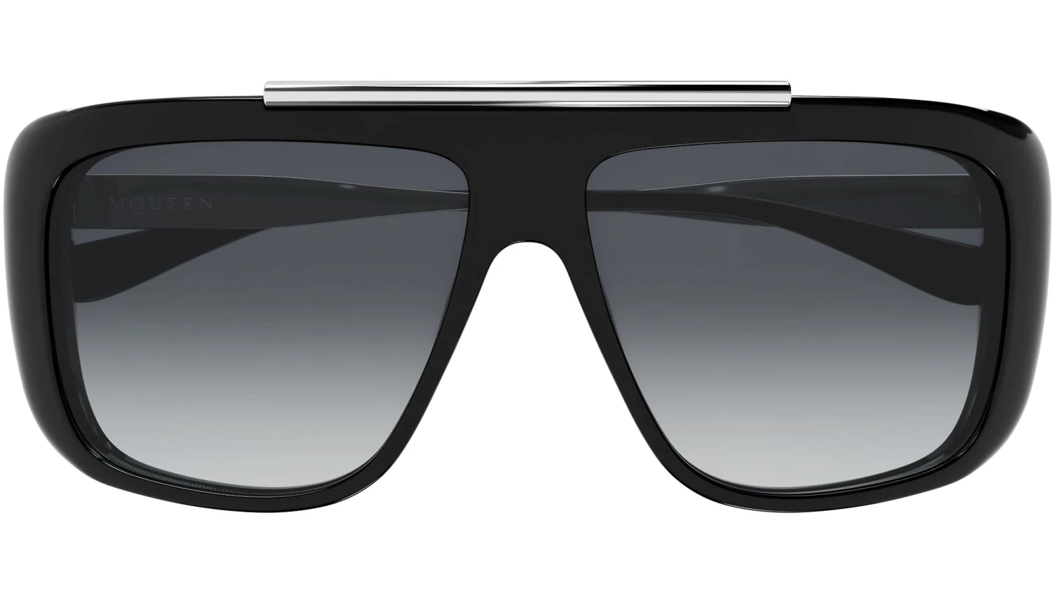 Alexander McQueen T-Bar line sunglasses model AM0492S for men and woman. Aviator recycled acetate frame shape. Color code 001 featuring shiny solid black front with silver temple and gradient grey lenses. Authorized Alexander McQueen online reseller. Your glasses will come with the original case and accessories and will be covered by a 12-month global warranty.