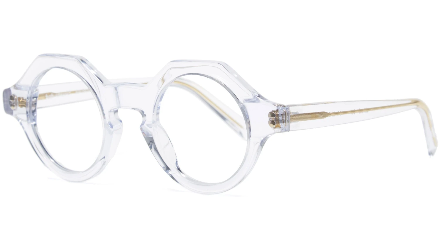Bob Sdrunk optical collection model Alfred 55 crystal frame with anti-glare lenses. The meticulous research into design, shapes, materials and the attention to single details result in high quality, original and unconventional eyewear. Bob wants to create something that never existed; something that finds its identity in the future whereas its origins and inspirations come from the past.