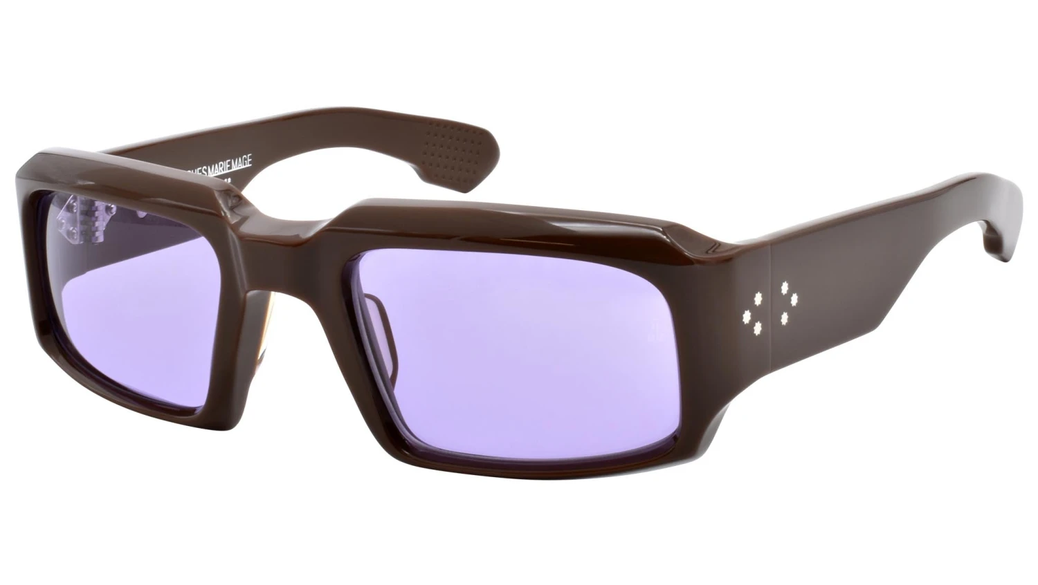 Brown 8 mm cured cellulose acetate frame and purple lenses. Hidden wirecore. Tension-secured custom 7 barrel hinge. Lavender CR-39 lens. 8 base lens with backside anti-reflective treatment. 100% UV protection.