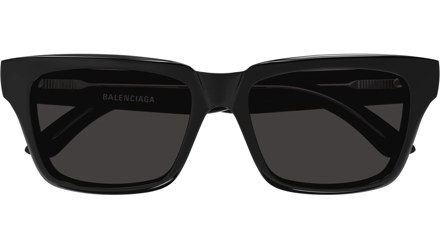 Balenciaga sunglasses model BB0346S from Everyday eyewear line, color code 001 shiny solid black recycled acetate, rectangle frame shape with solid grey lens.