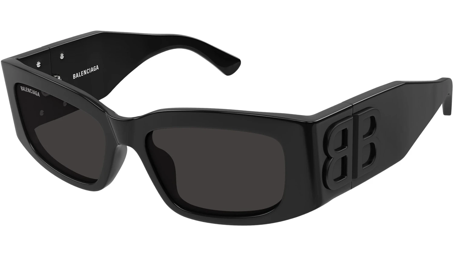 Balenciaga sunglasses model BB0360S from Everyday eyewear line, color code 001 shiny solid black recycled acetate, rectangle frame shape with solid grey lens.