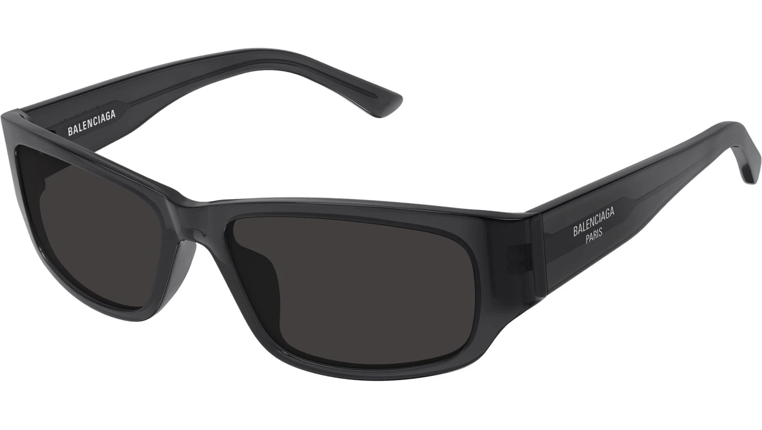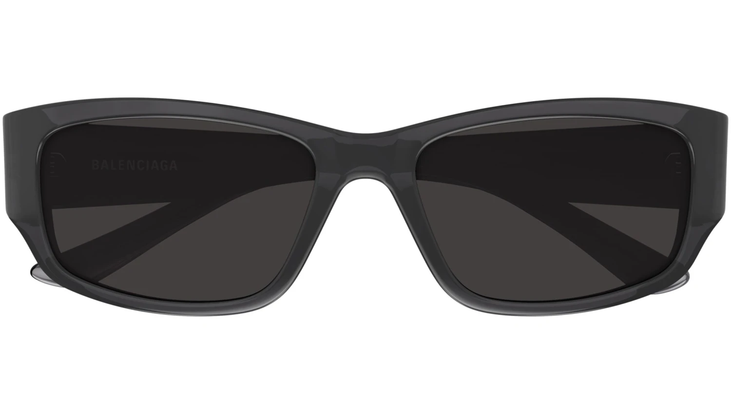 Balenciaga sunglasses model BB0368SK from Everyday eyewear line, color code 004 shiny transparent dark grey recycled acetate, rectangle frame shape with solid grey lens.