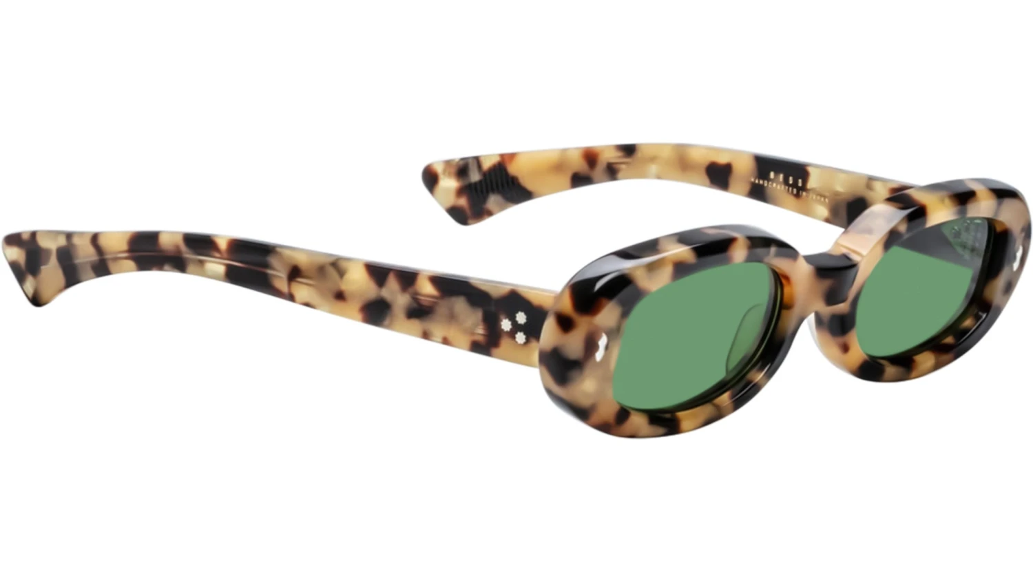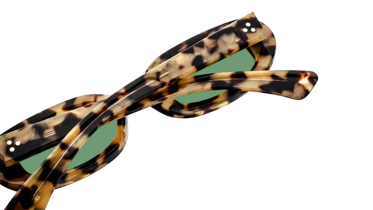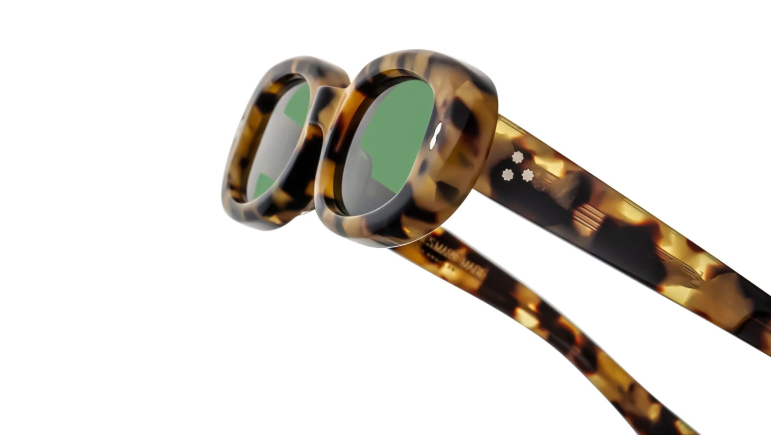 Havana 8mm cured cellulose acetate frame with custom acetate temples featuring precious metal hardware and green lenses. Sterling silver double-arrowhead front pin, hidden silver lever wirecore, and a silver tension-secured custom 7-barrel hairline hinge enhance the design. Highland CR-39 2 base lenses with backside anti-reflective treatment provide clarity and comfort. Frame shape: circular. Provides 100% UV protection.