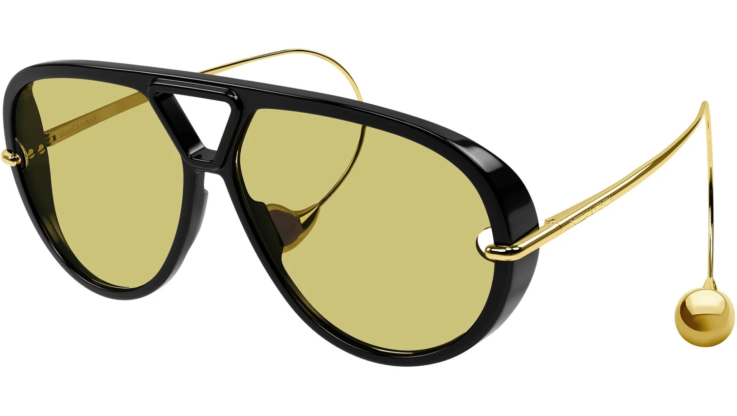 Bottega Veneta Drop Aviator sunglasses model BV1273S from Unapologetic eyewear line, color code 003 shiny solid black recycled acetate, geometric frame shape with solid mustard lens.