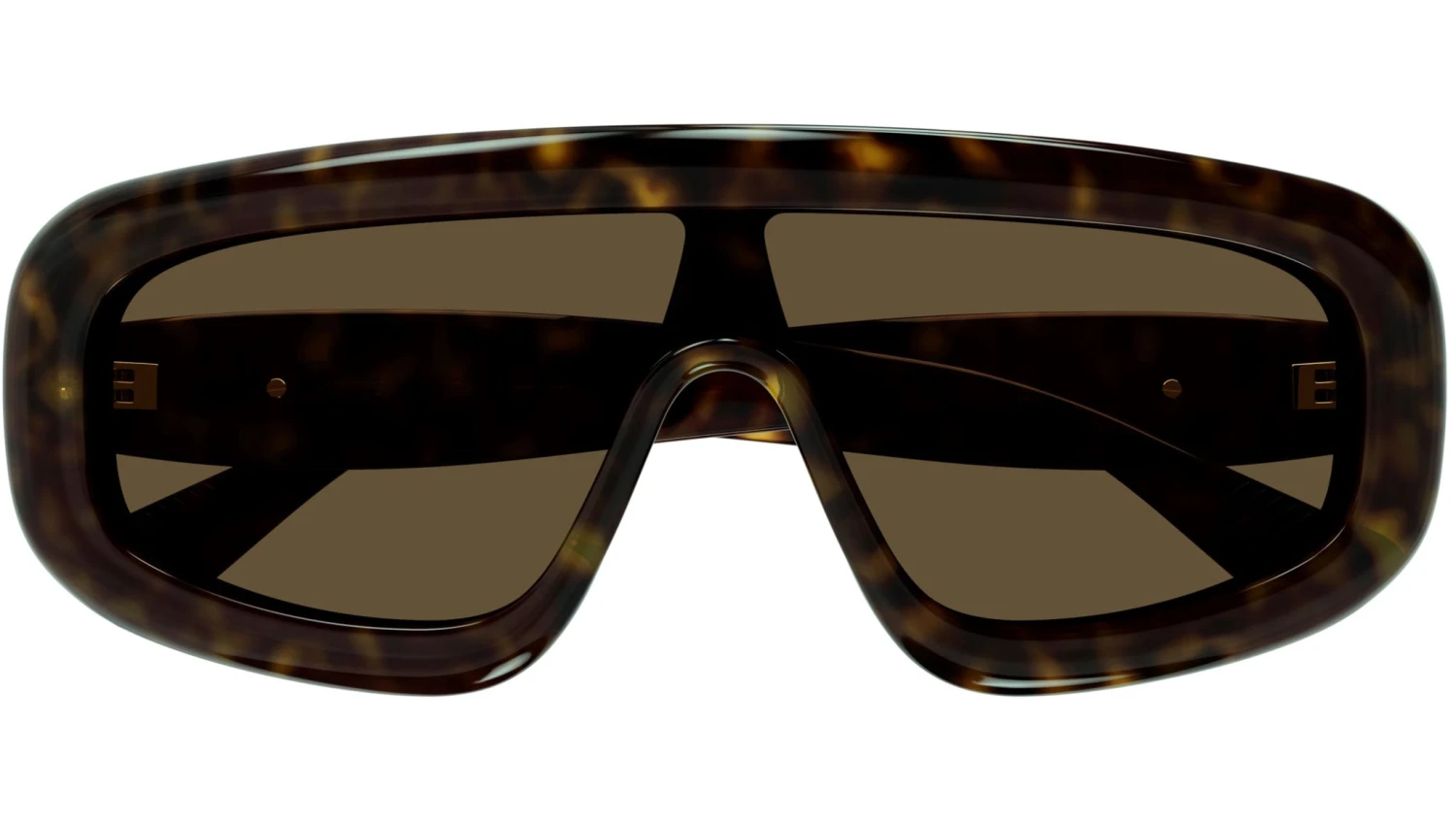 Bottega Veneta sunglasses model BV1281S from New Classic eyewear line, color code 002 shiny dark havana recycled acetate, shield frame shape with solid brown lens.