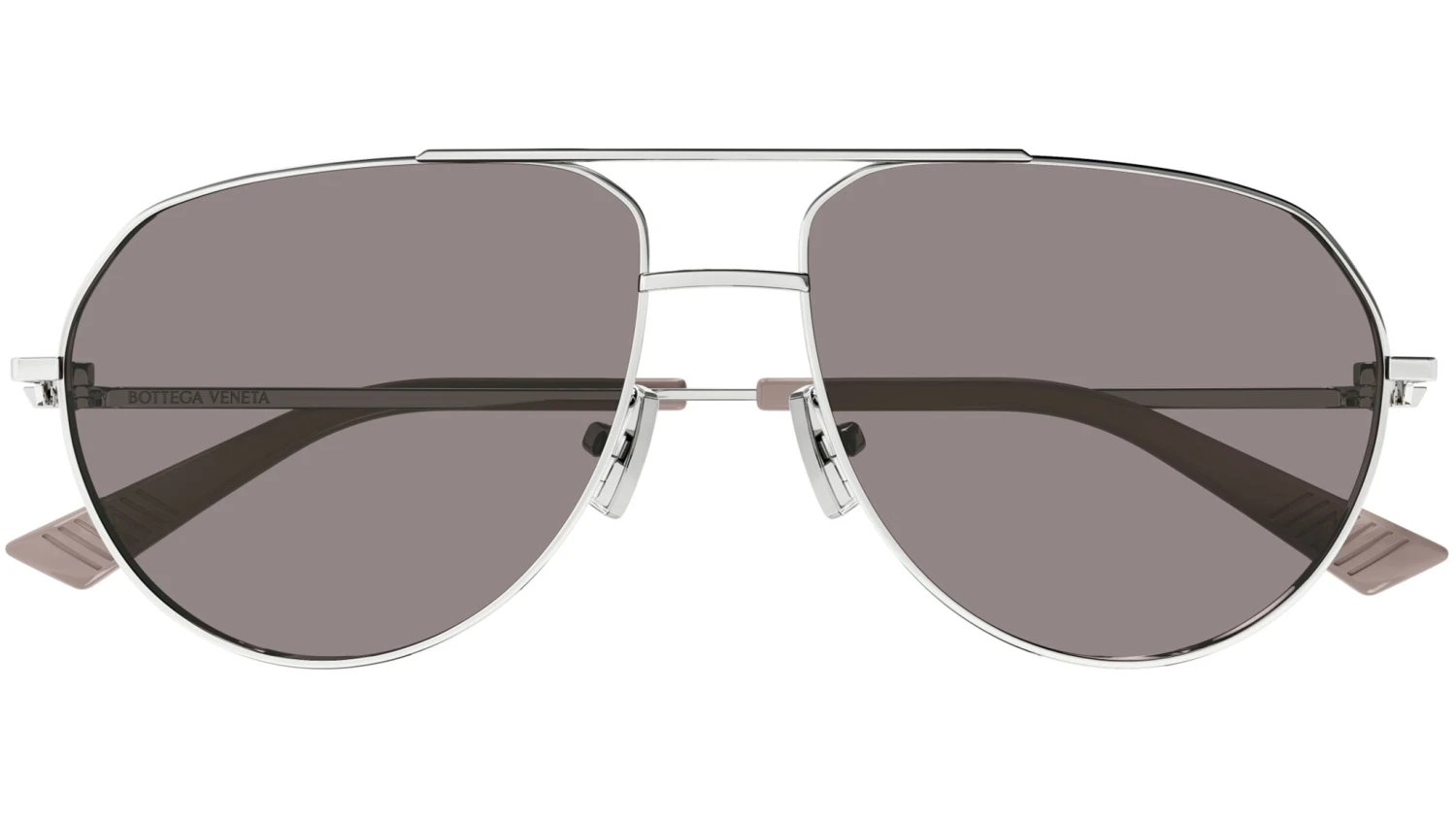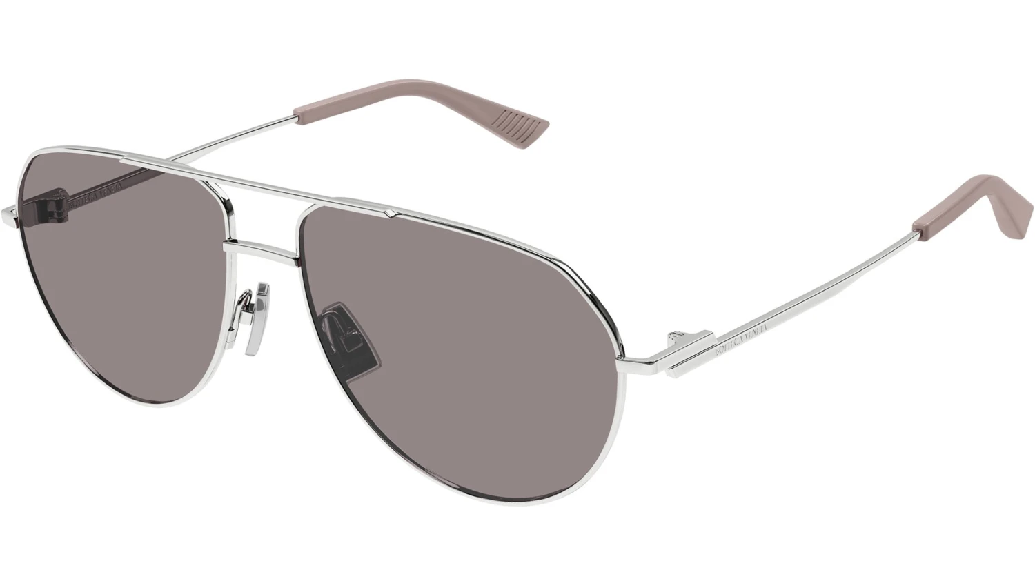 Bottega Veneta sunglasses model BV1302S from Minimalist eyewear line, color code 004 shiny silver metal, aviator frame shape with solid greyish violet lens.