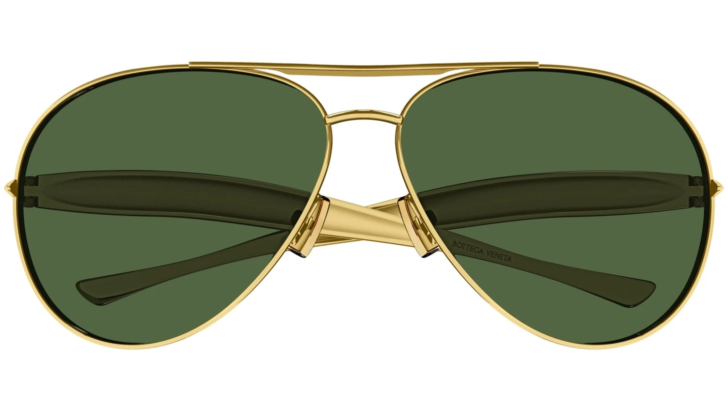 Bottega Veneta sunglasses model BV1305S from Unapologetic eyewear line, color code 001 shiny gold metal, aviator frame shape with soild green lens.