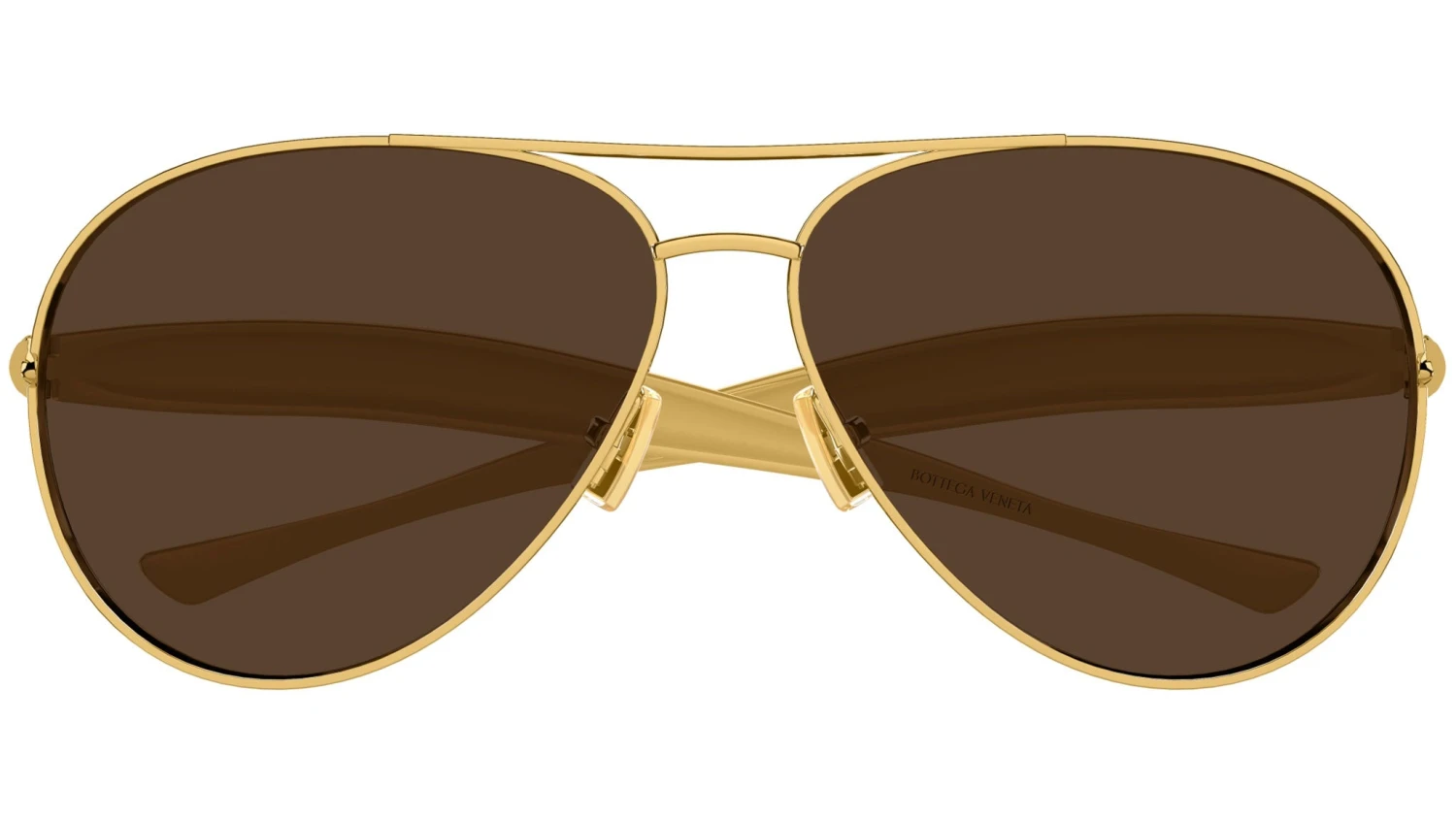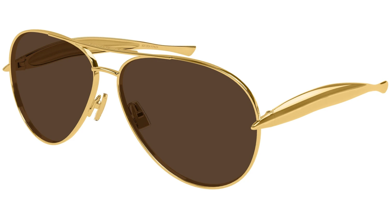 Bottega Veneta BV1305S 007 sunglasses for men and woman, featuring shiny gold pilot metal frame and solid brown bio nylon lenses. Brand line: Unapologetic. Style code: BV1305S. Color code: 007. Made in Japan. Authorized Bottega Veneta online reseller. Your glasses will include the original case and accessories and are covered by a 12-month global warranty.