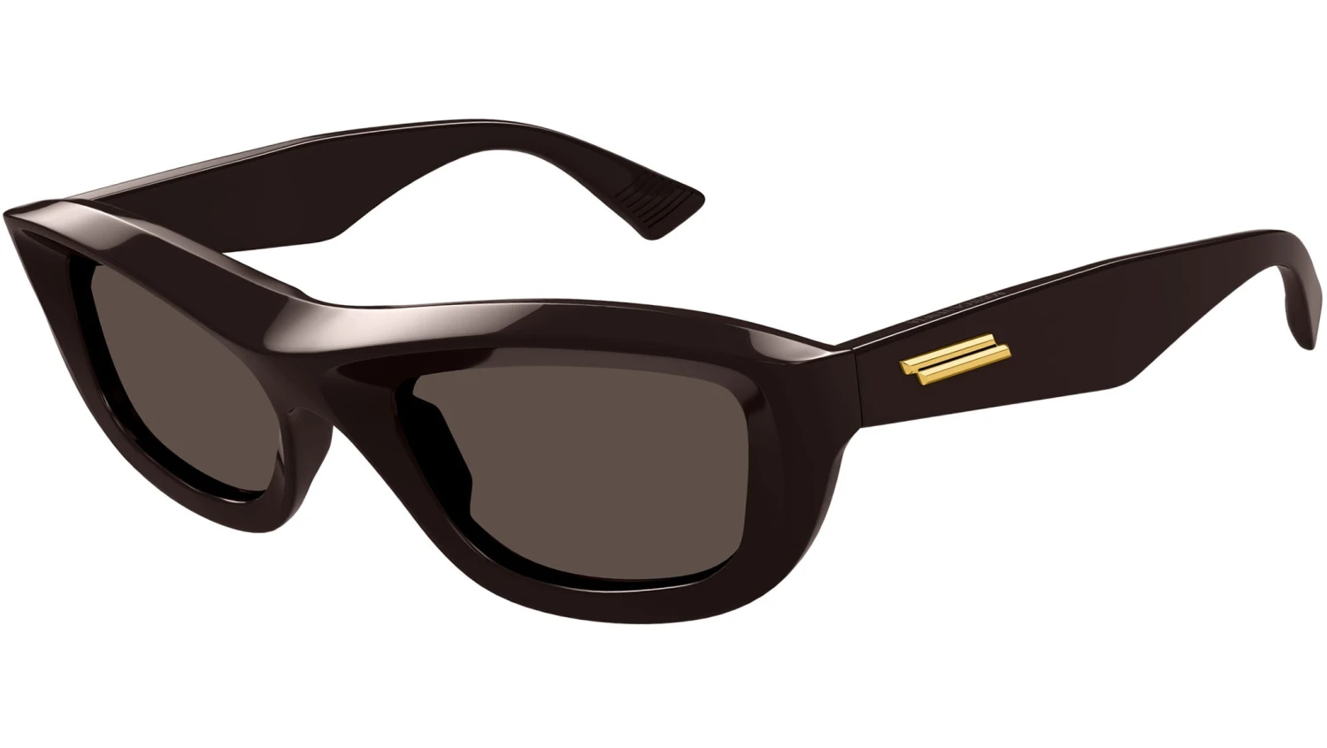 Bottega Veneta sunglasses model BV1326S geometric injection frame color code 002 shiny solid brown with brown temple and solid brown lenses. Authorized Bottega Veneta online reseller. Your glasses will come with the original case and accessories and will be covered by a 12-month global warranty.
