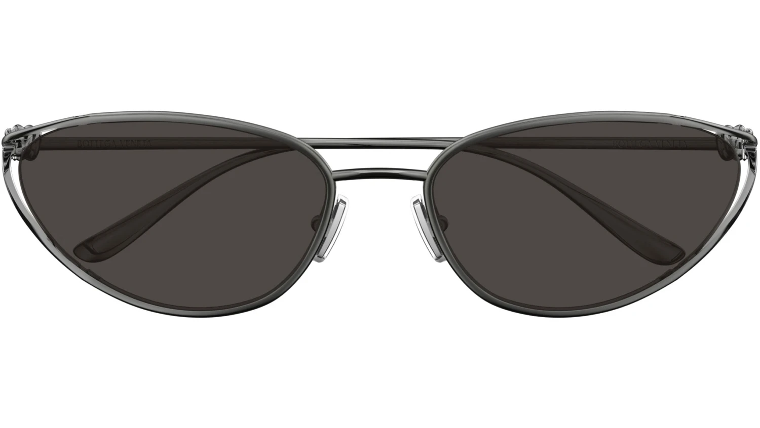 Bottega Veneta sunglasses model BV1330S cat eye metal frame color code 001 shiny dark ruthenium with ruthenium temple and solid grey lenses. Authorized Bottega Veneta online reseller. Your glasses will come with the original case and accessories and will be covered by a 12-month global warranty.