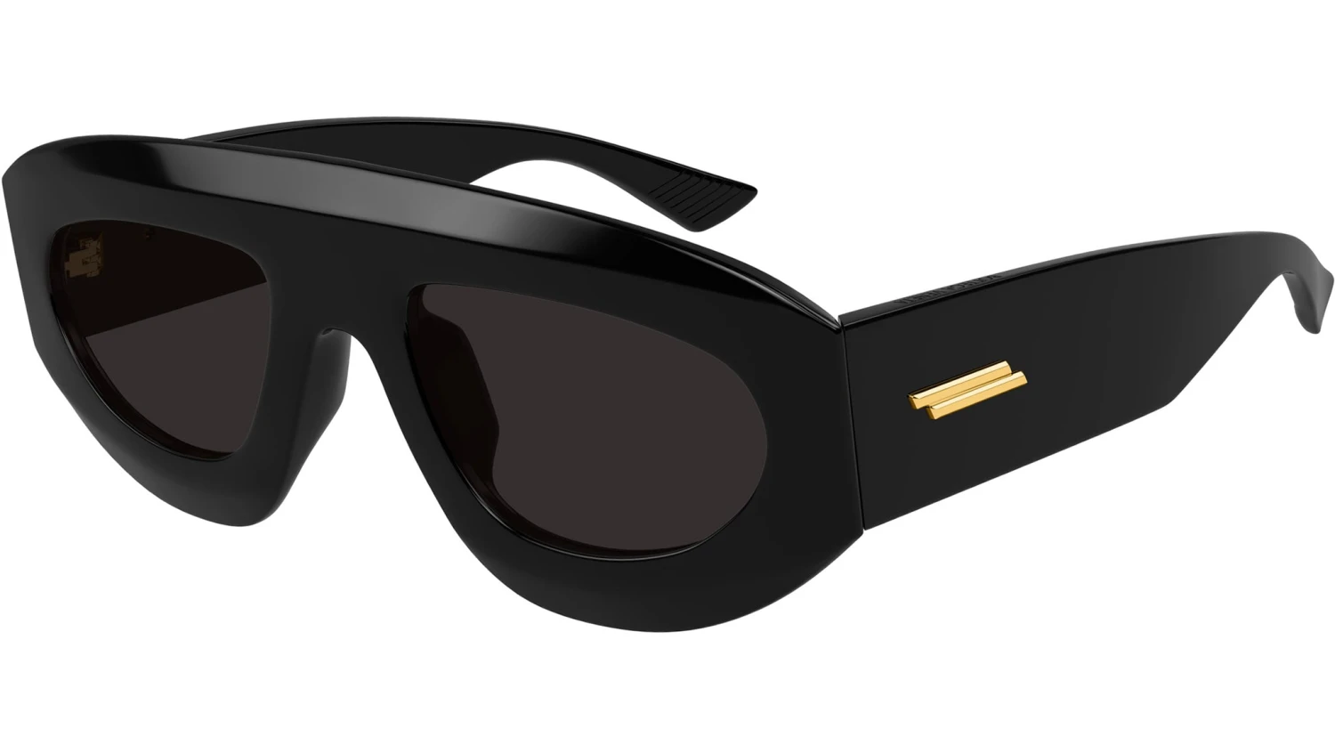 Bottega Veneta BV1358S 001 sunglasses for men and woman, featuring shiny solid black geometric recycled acetate frame and solid grey bio nylon lenses. Brand line: Ribbon. Style code: BV1358S. Color code: 001. Made in Italy. Authorized Bottega Veneta online reseller. Your glasses will include the original case and accessories and are covered by a 12-month global warranty.