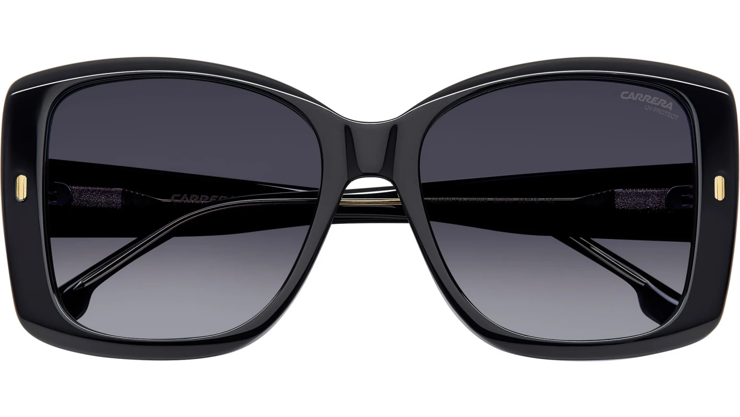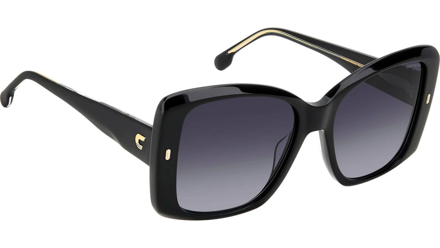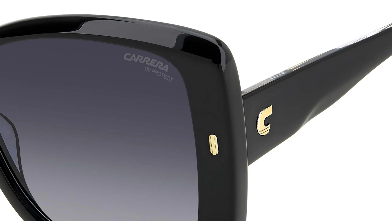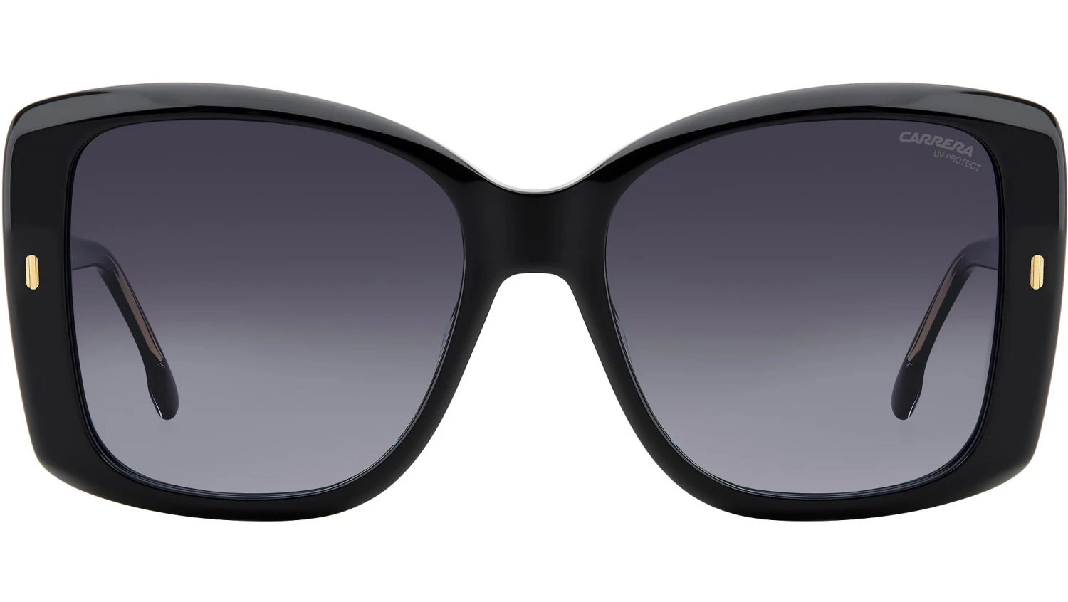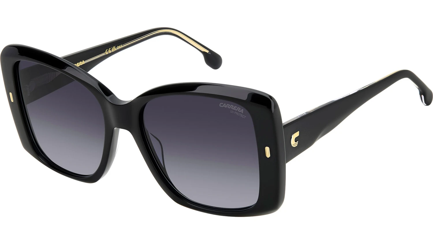 Carrera 3030/S 807 9O sunglasses for women, featuring black squared acetate frame and dark grey shaded lenses. More than simple sunglasses, this Carrera look is a personal style statement. The butterfly shape is sophisticated, characterised by bold proportions that are in-line with the latest trends. The acetate structure is brightened by metal inserts, such as the rivets on the front and the embossed ‘C’ on the temples. These frames can be fitted with prescription lenses, and some versions come with polarized lenses. Brand line: Flag. Style code: 206946. Color code: 807 9O. Authorized Carrera online reseller. Your glasses will include the original case and accessories and are covered by a 12-month global warranty.