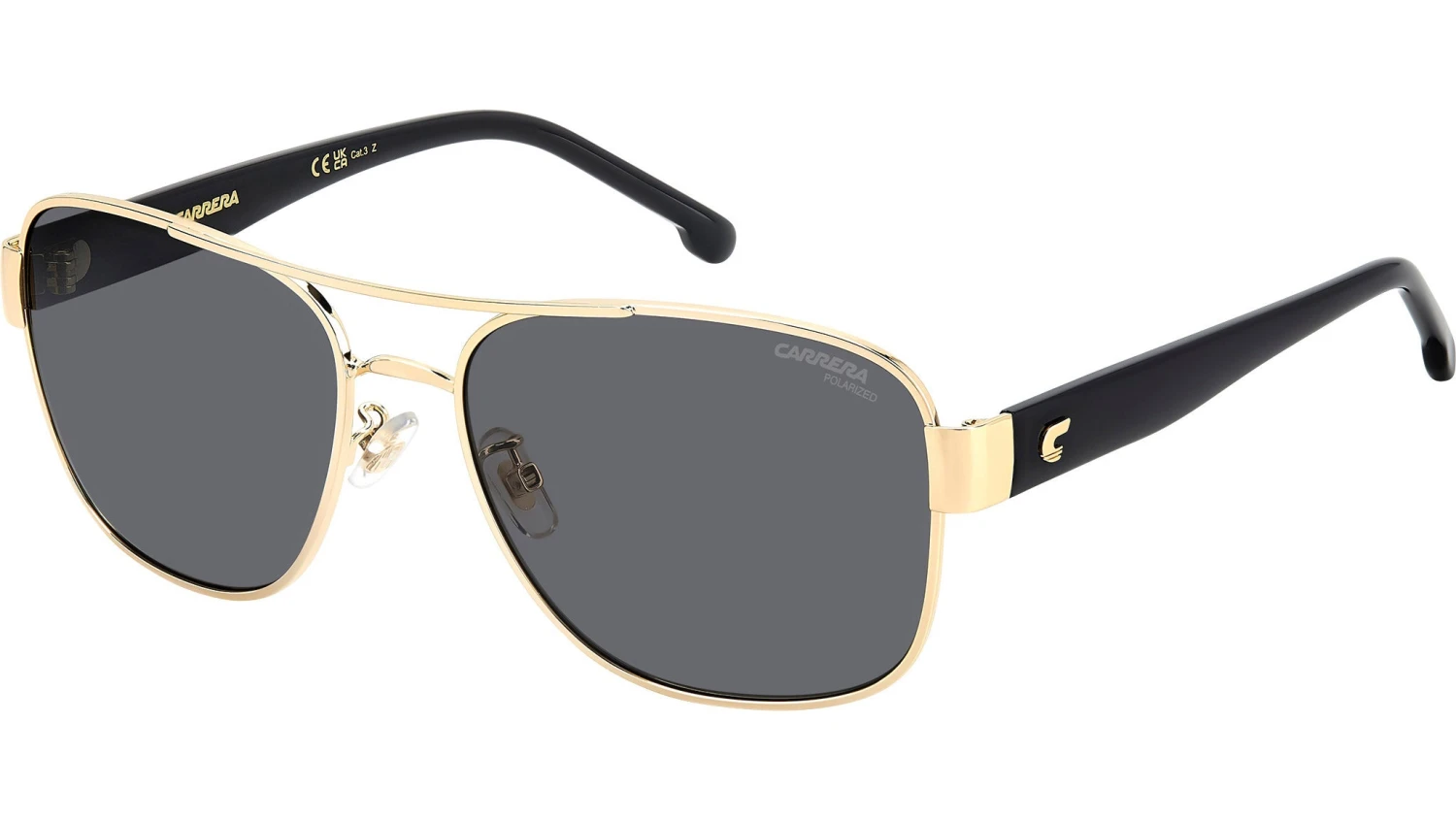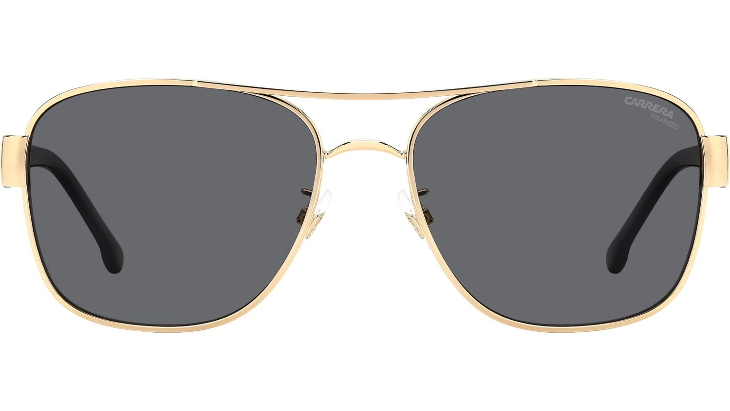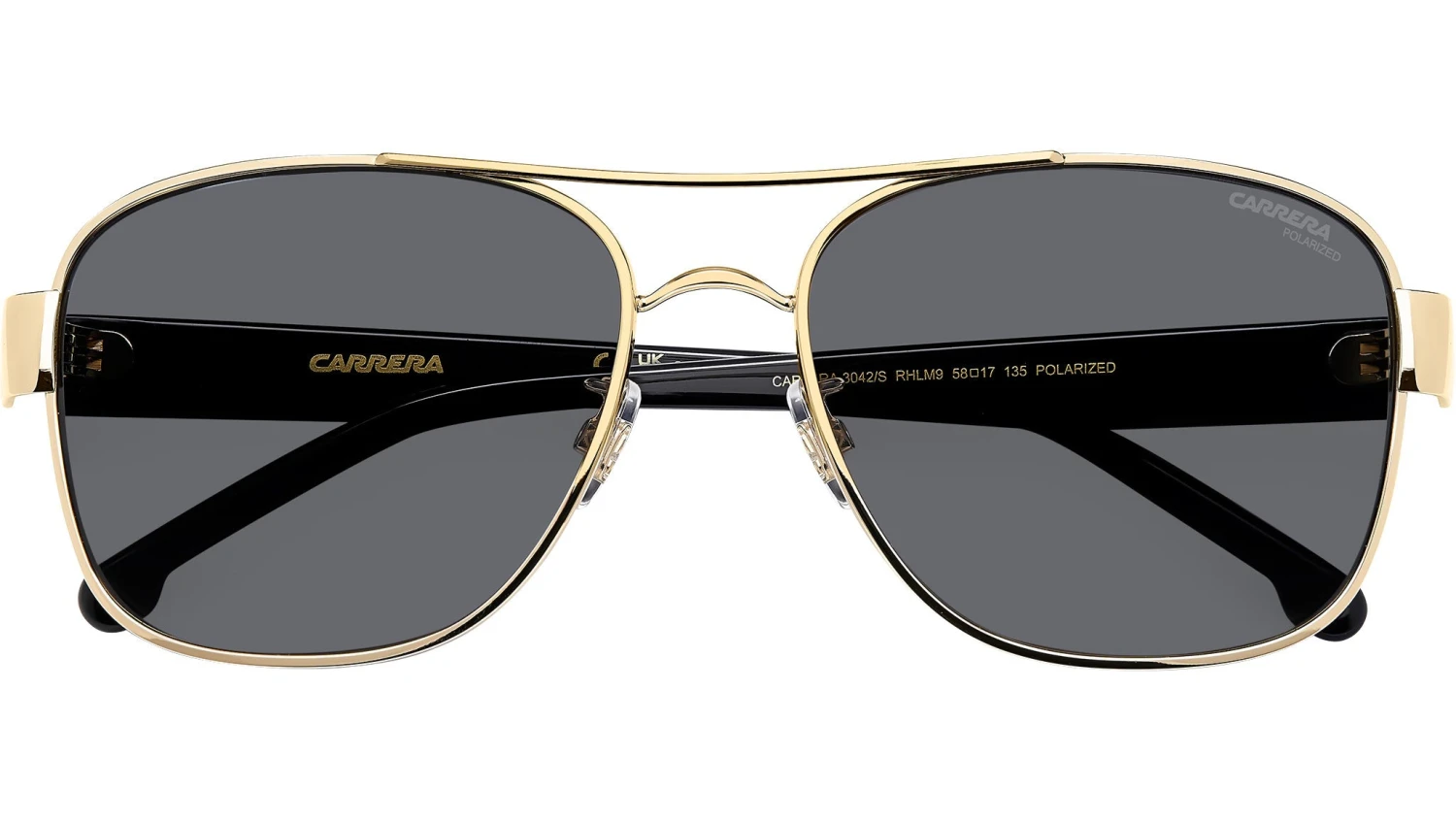 Carrera 3042/S RHL M9 sunglasses for women, featuring gold black rectangular metal frame and grey polarized lenses. These Carrera women’s sunglasses instantly bring incomparable style to any ensemble. The eyes are protected by the full-coverage front, with rims in different tones of gold united by a double bridge. A style to wear well beyond the sunniest hours of the day, especially when fitted with prescription lenses, these frames are extra stable thanks to adjustable nose pads. They also come in a version with multi-layer temples, or with polarized lenses. Brand line: Signature. Style code: 207627. Color code: RHL M9. Authorized Carrera online reseller. Your glasses will include the original case and accessories and are covered by a 12-month global warranty.