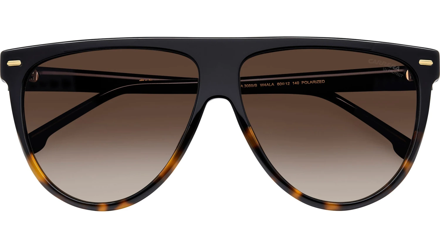 Carrera 3055/S W4A LA sunglasses for women, featuring black shaded havana rectangular acetate frame and brown shaded polarized lenses. These Carrera women’s sunglasses take a classic look and give it a Carrera twist. Flat along the top, one version has a contrast insert to accentuate the silhouette. The metal rivets add a bit of shine, and the embossed ‘C’ on the temples is instantly recognizable. The gradient aviator lenses come in polarized versions. Brand line: Signature. Style code: 207948. Color code: W4A LA. Authorized Carrera online reseller. Your glasses will include the original case and accessories and are covered by a 12-month global warranty.
