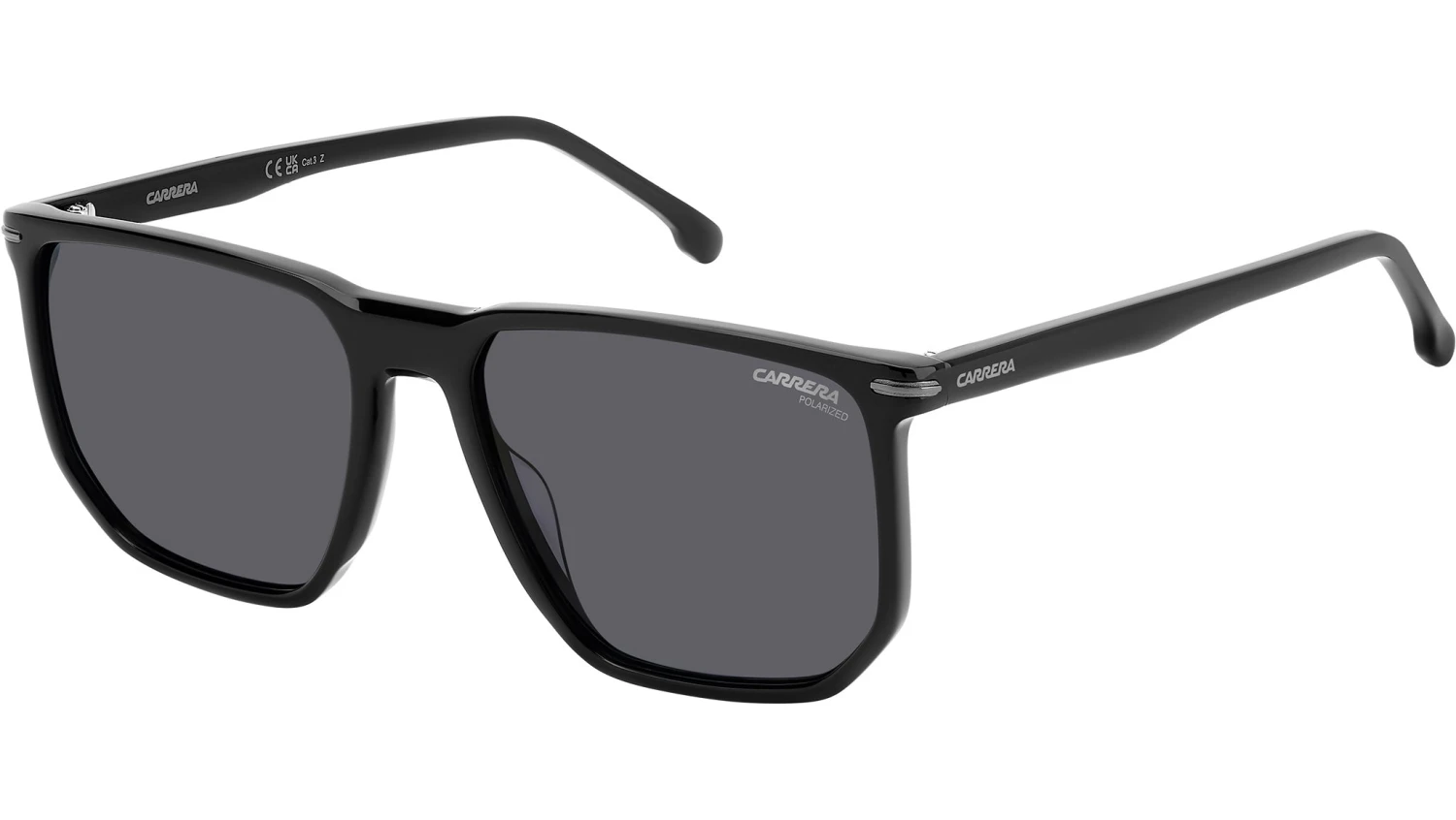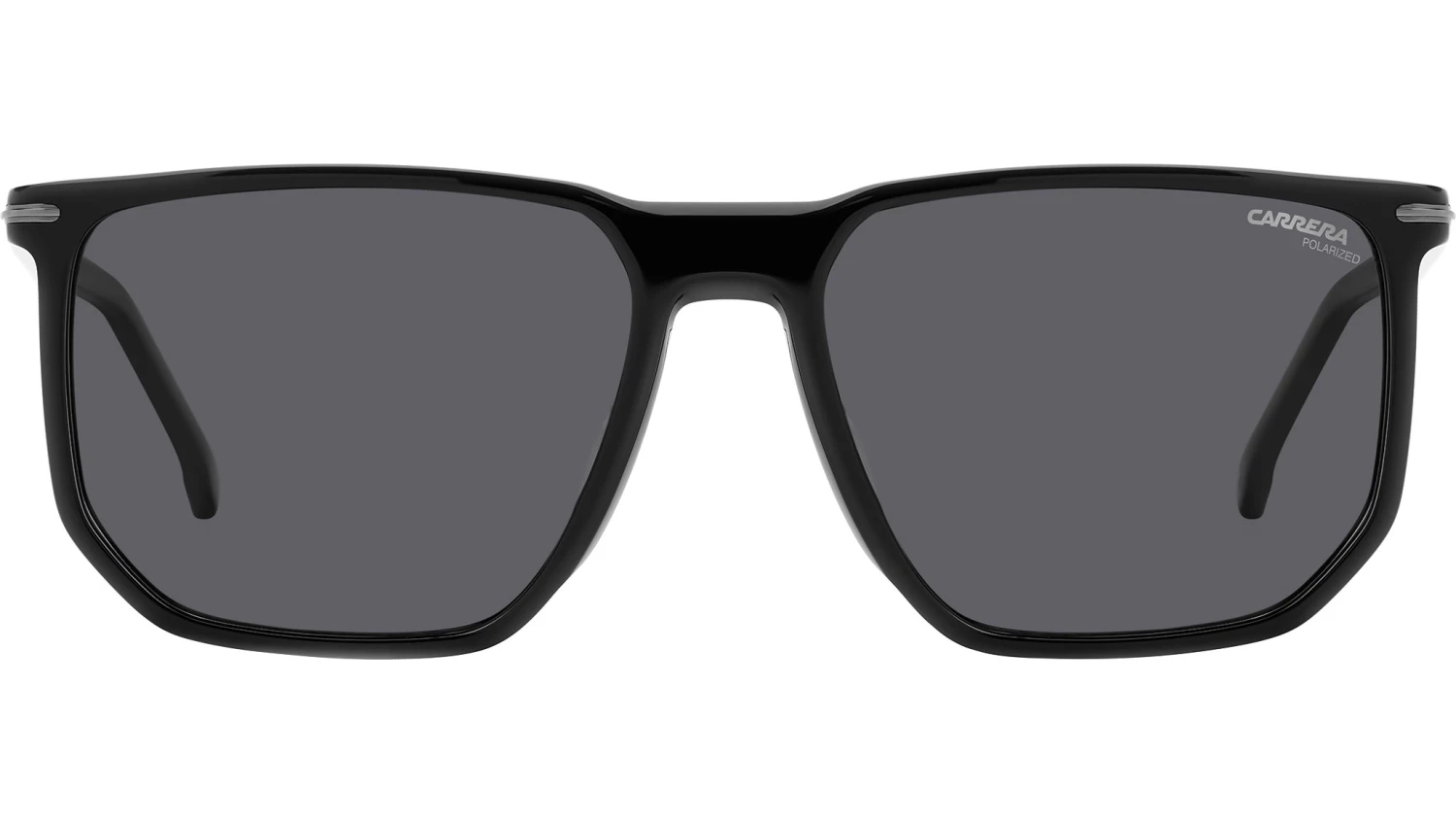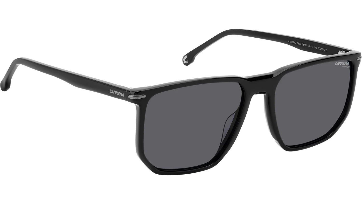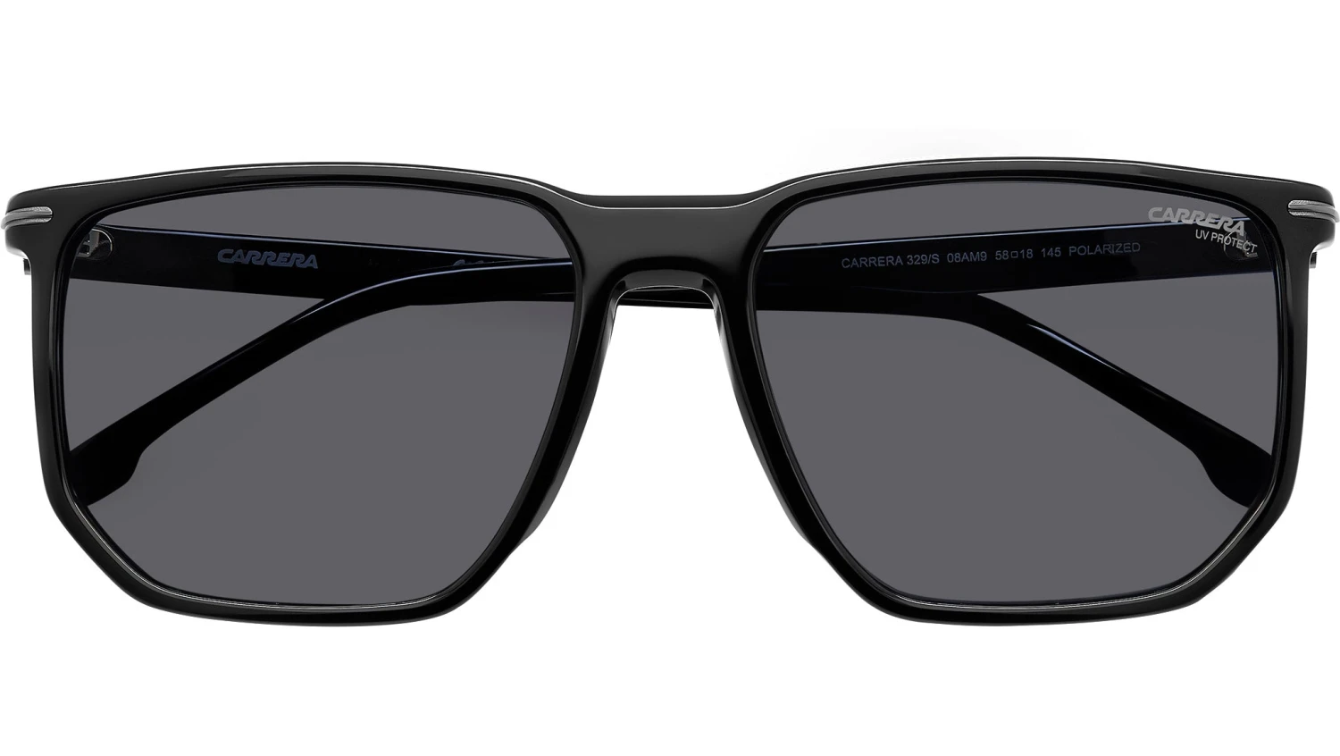 Carrera 329/S 08A M9 sunglasses for men, featuring black grey rectangular acetate frame and grey polarized lenses. These Carrera sunglasses will upgrade any wardrobe. Fans of iconic accessories will love the geometric front with a flat topline, accompanied by fin temples (including a multi-layer option). The structure is slim, compact and lightweight. The embossed ‘C’ on the sides of the frames are a meticulous detail that identifies the brand. The lenses shield the face with undeniable style, also in polarized and mirrored versions. These frames can be fitted with prescription lenses. Brand line: Signature. Style code: 206727. Color code: 08A M9. Authorized Carrera online reseller. Your glasses will include the original case and accessories and are covered by a 12-month global warranty.
