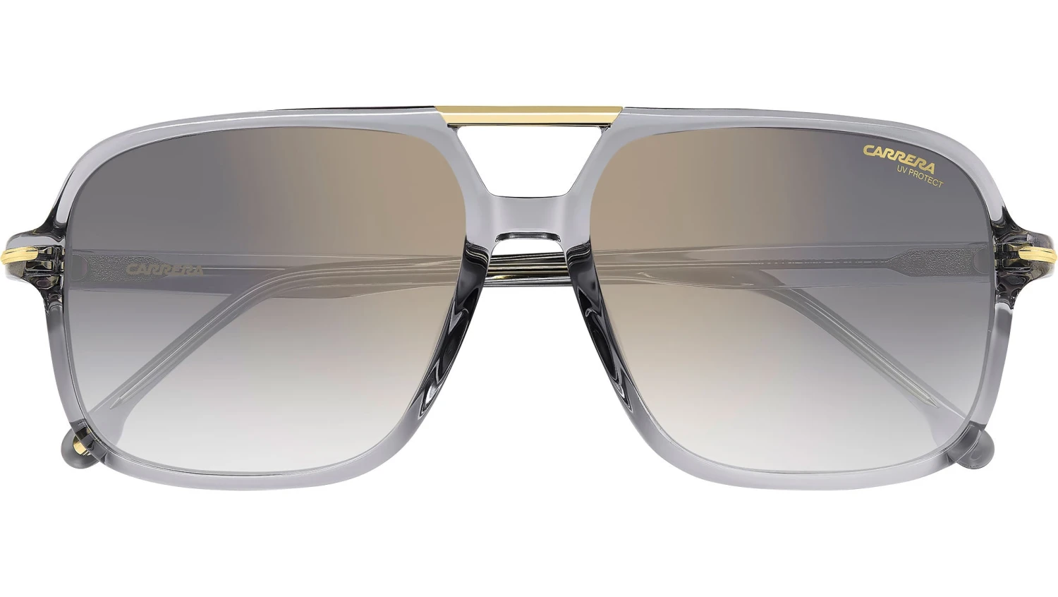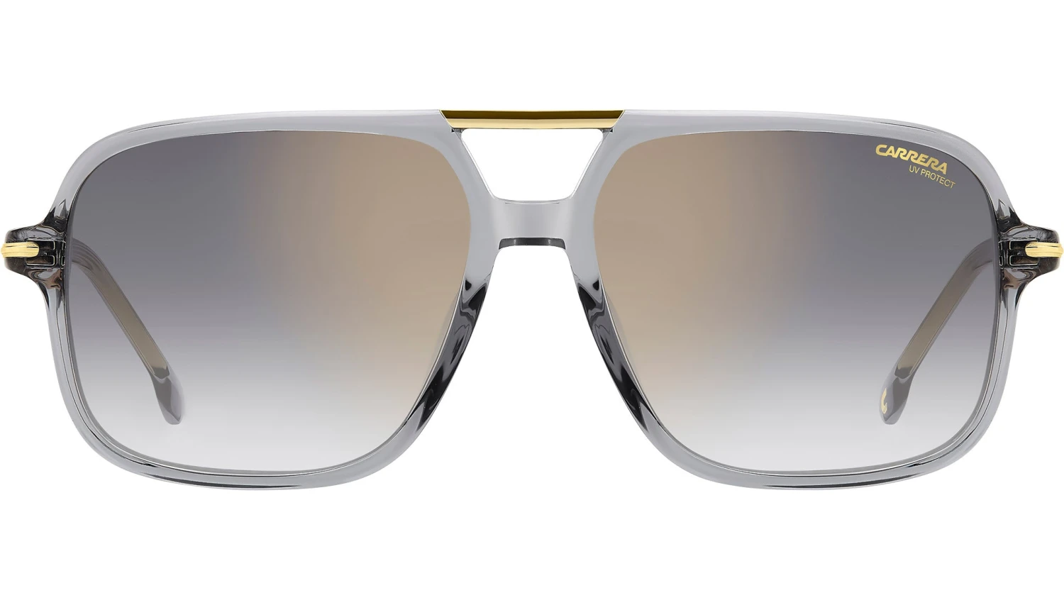 Carrera 350/S KB7 FQ sunglasses for men, featuring grey rectangular acetate frame and grey shaded gold mirror lenses. There’s clear vintage inspiration in these sunglasses. Carrera has tapped into its archives to develop the navigator frames with a double bridge, a look that’s as famous as it is characteristic of the brand. Metal inserts stand out on the acetate structure, including the Carrera ‘C’ which connects the front to the temples. The lenses come in mirrored, polarized or photochromic versions, the latter capable of darkening when exposed to bright light. Brand line: Signature. Style code: 207880. Color code: KB7 FQ. Authorized Carrera online reseller. Your glasses will include the original case and accessories and are covered by a 12-month global warranty.