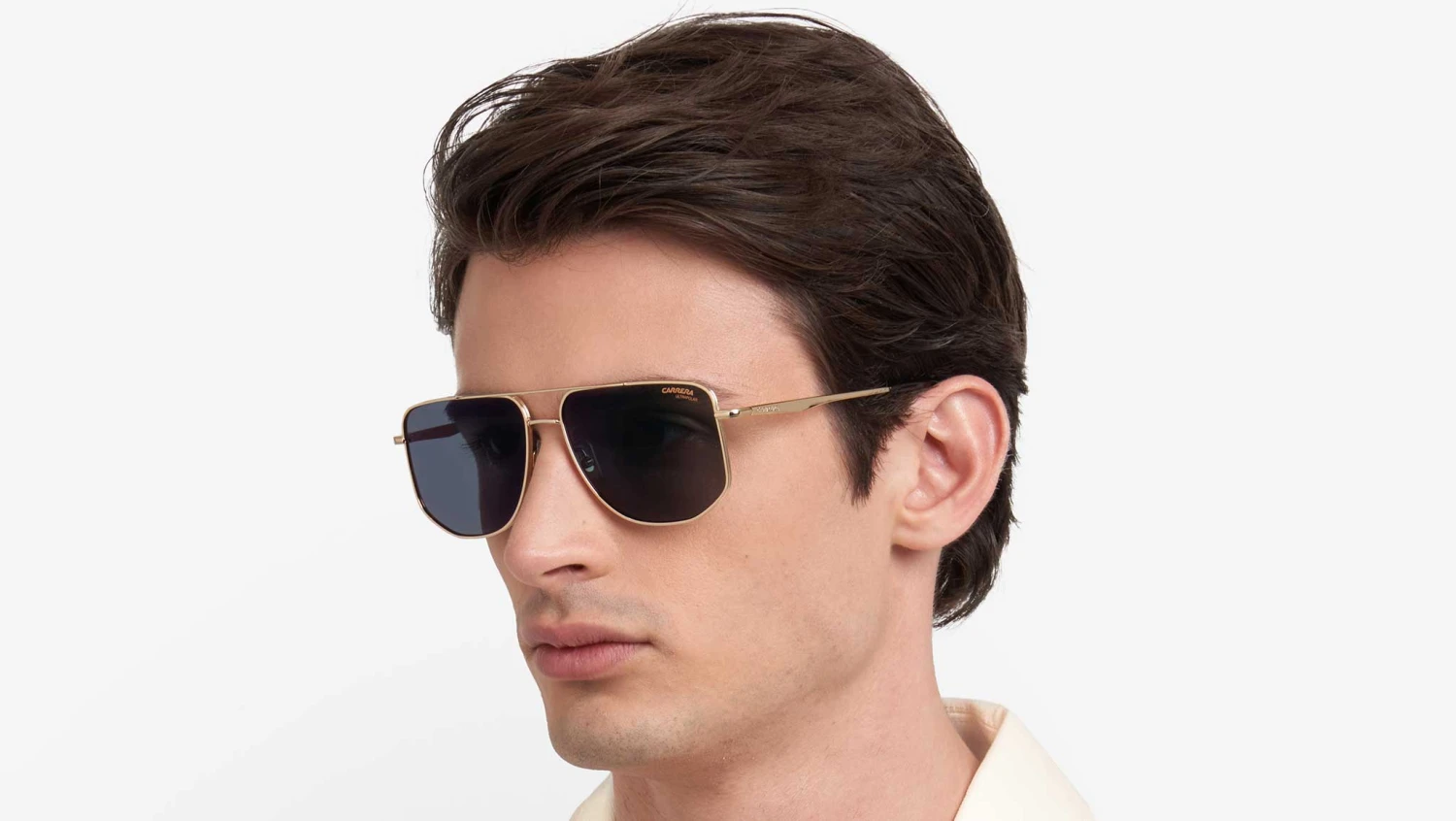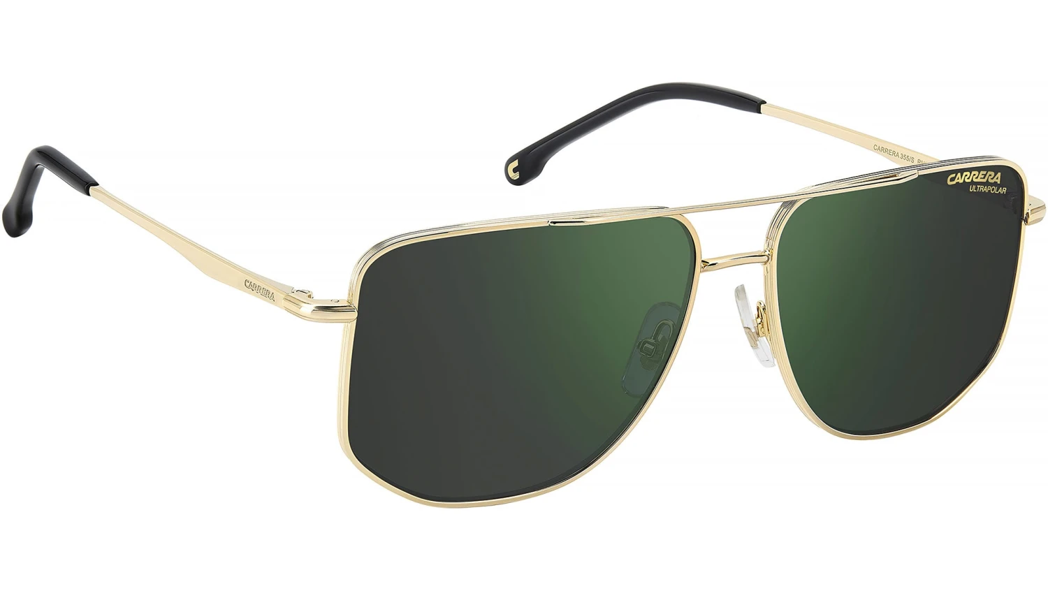 Carrera 355/S RHL Q3 sunglasses for men, featuring gold black rectangular metal frame and greengrey sp pz hight contrast antirefle lenses. These sunglasses celebrate Carrera heritage. The double-bridge frames are timeless and the metal temples are direct from the Carrera archives. The connection to the front takes the shape of the iconic flag, and the acetate end tips come in multilayer options in the brand’s colours. The gradient lenses are eternal, brought into focus by polarized or ultrapolar versions. Brand line: Signature. Style code: 207881. Color code: RHL Q3. Authorized Carrera online reseller. Your glasses will include the original case and accessories and are covered by a 12-month global warranty.