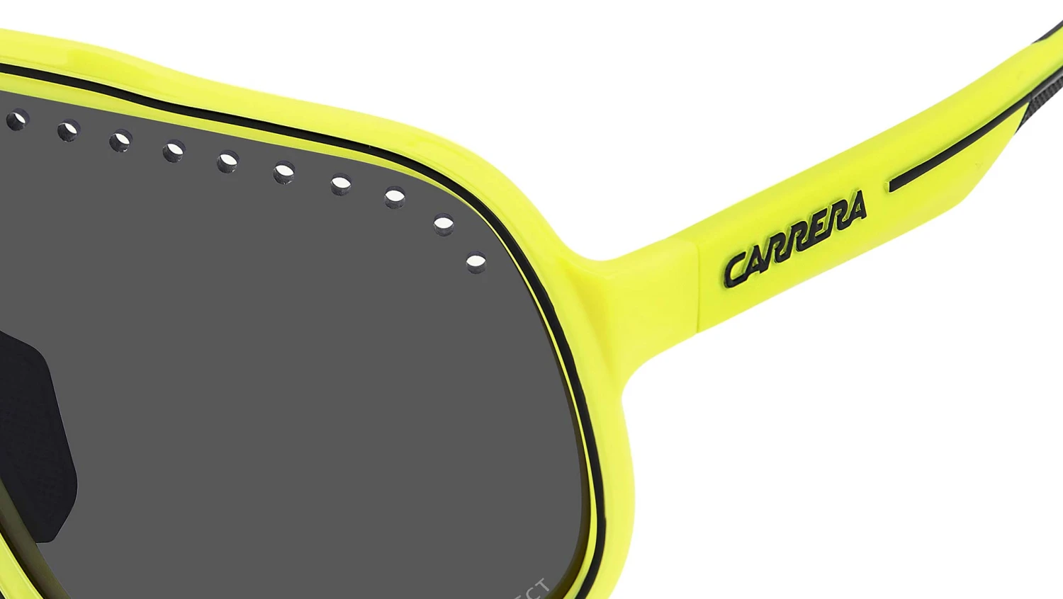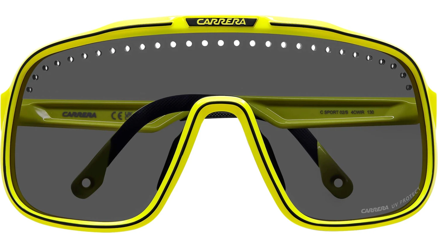 Carrera C SPORT 02/S 4CW IR sunglasses for men, featuring yellow black shield injection frame and grey lenses. Inspired by sport and designed to be worn everywhere, these sunglasses express the bold style of Carrera. The shield front is decisive and on-trend as it wraps around to the sides, complete with perforations for added ventilation. The lens even comes in mirrored or high-contrast options. Impeccable with sporty outfits and unforgettable as part of street-style ensembles, these sunglasses are designed to be worn with ease, even under a helmet. The front is compatible with prescription clip-in lenses which can be purchased separately. Brand line: Sport. Style code: 207992. Color code: 4CW IR. Authorized Carrera online reseller. Your glasses will include the original case and accessories and are covered by a 12-month global warranty.