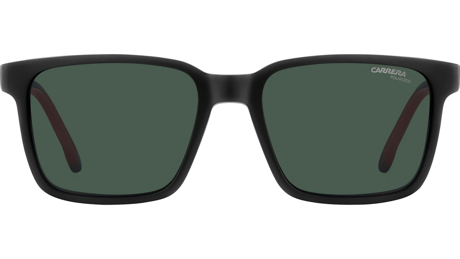 Carrera CA 8069/CS BLX UC sunglasses for men, featuring matte black red rectangular injection frame and green polarized lenses. Connoisseurs of practical style will love these Carrera eyeglasses. Their square frames in injected polyamide are designed to be flaunted with everyday ensembles. With rubberised details on the temples, a sporty look is guaranteed. These glasses are accompanied by foldable, polarized clip-on sun lenses. They attach to the front thanks to magnets, so that comfortably looking at the world on sunny days is quick, easy and carefree. Brand line: Sport. Style code: 207604. Color code: BLX UC. Authorized Carrera online reseller. Your glasses will include the original case and accessories and are covered by a 12-month global warranty.