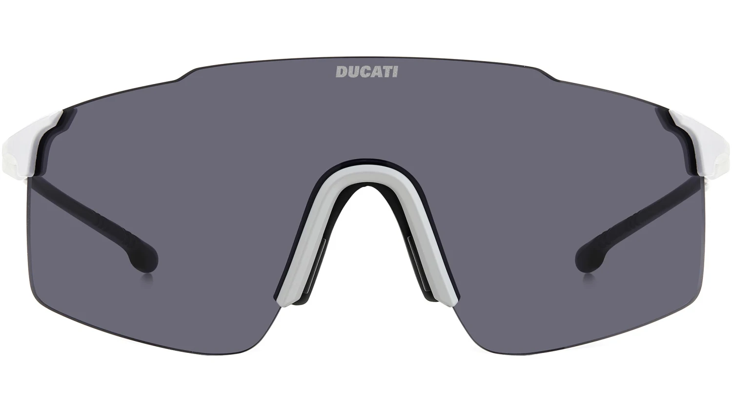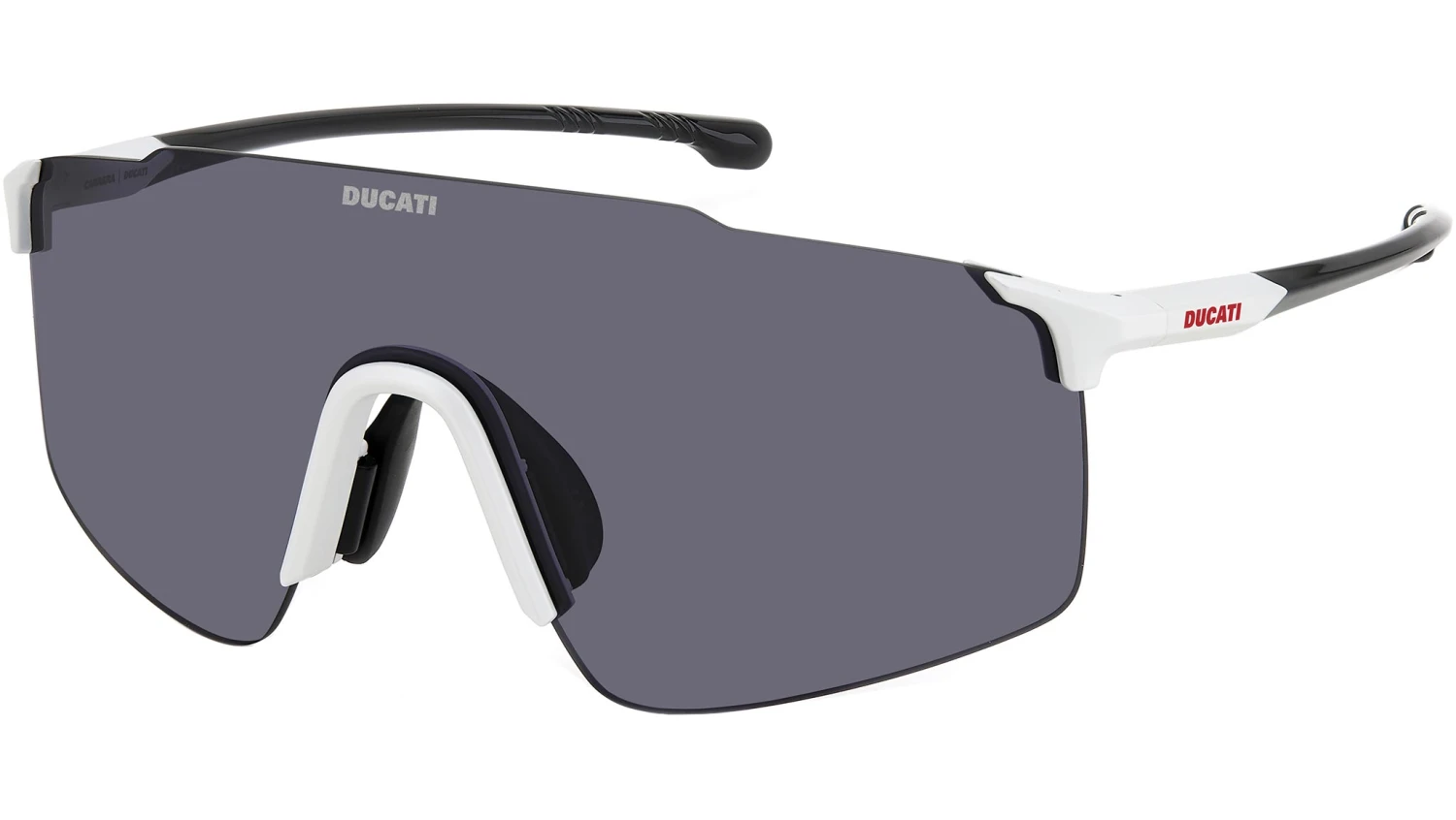 Carrera Ducati sunglasses model CarDuc 033/S color code 6HT IR Matte White. From the world of fashion to races at the track, these sunglasses by Carrera | Ducati are a round-trip journey of inspiration. The shield front is formed by a maxi-lens with a rimless design and Ducati logo detail front and centre. It also comes in a mirrored version that’s perfect for decisive looks. Stability and comfort are provided by the adjustable ergonomic nose pads. The temples are slim and lightweight, extending into straight end tips in shiny rubber that facilitate their use under a helmet.