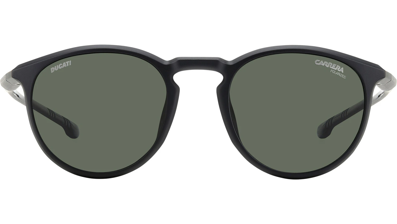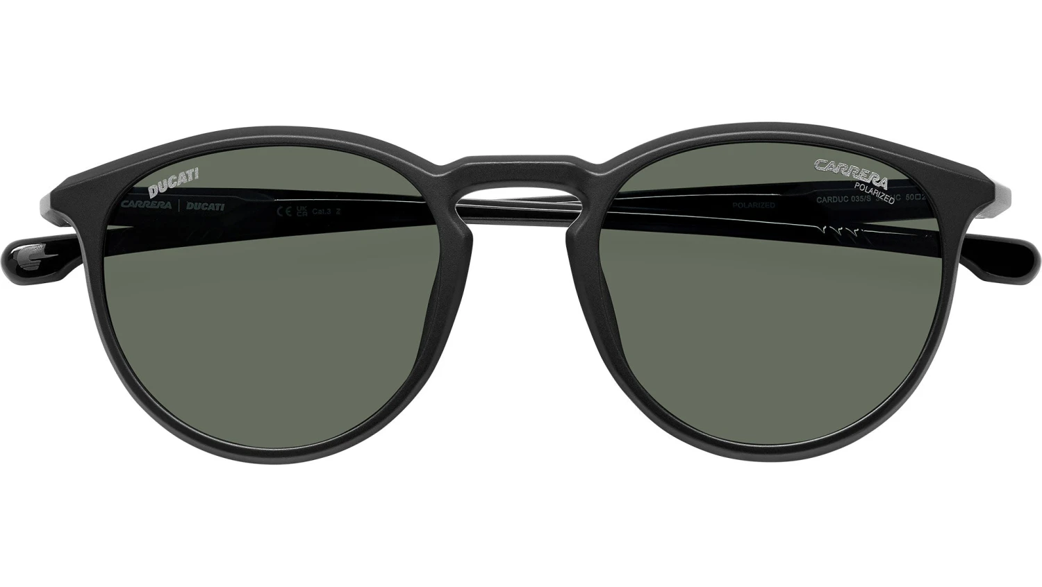Carrera Ducati CARDUC 035/S 3OL UC sunglasses for men, featuring matte black green panthos injection frame and green polarized lenses. These sunglasses by Carrera | Ducati bring style to the racetrack. The pantos front with a keyhole bridge complements almost any face, even those of women who want to go bold with a sporty look. The temples are a tribute to the design of the Panigale, while the slender silhouettes and the shiny rubber end tips make these glasses ideal under a motorcycle helmet. Vision is optimised when they’re fitted with prescription lenses, whether mirrored or polarized. Brand line: Paddock. Style code: 206750. Color code: 3OL UC. Authorized Carrera Ducati online reseller. Your glasses will include the original case and accessories and are covered by a 12-month global warranty.