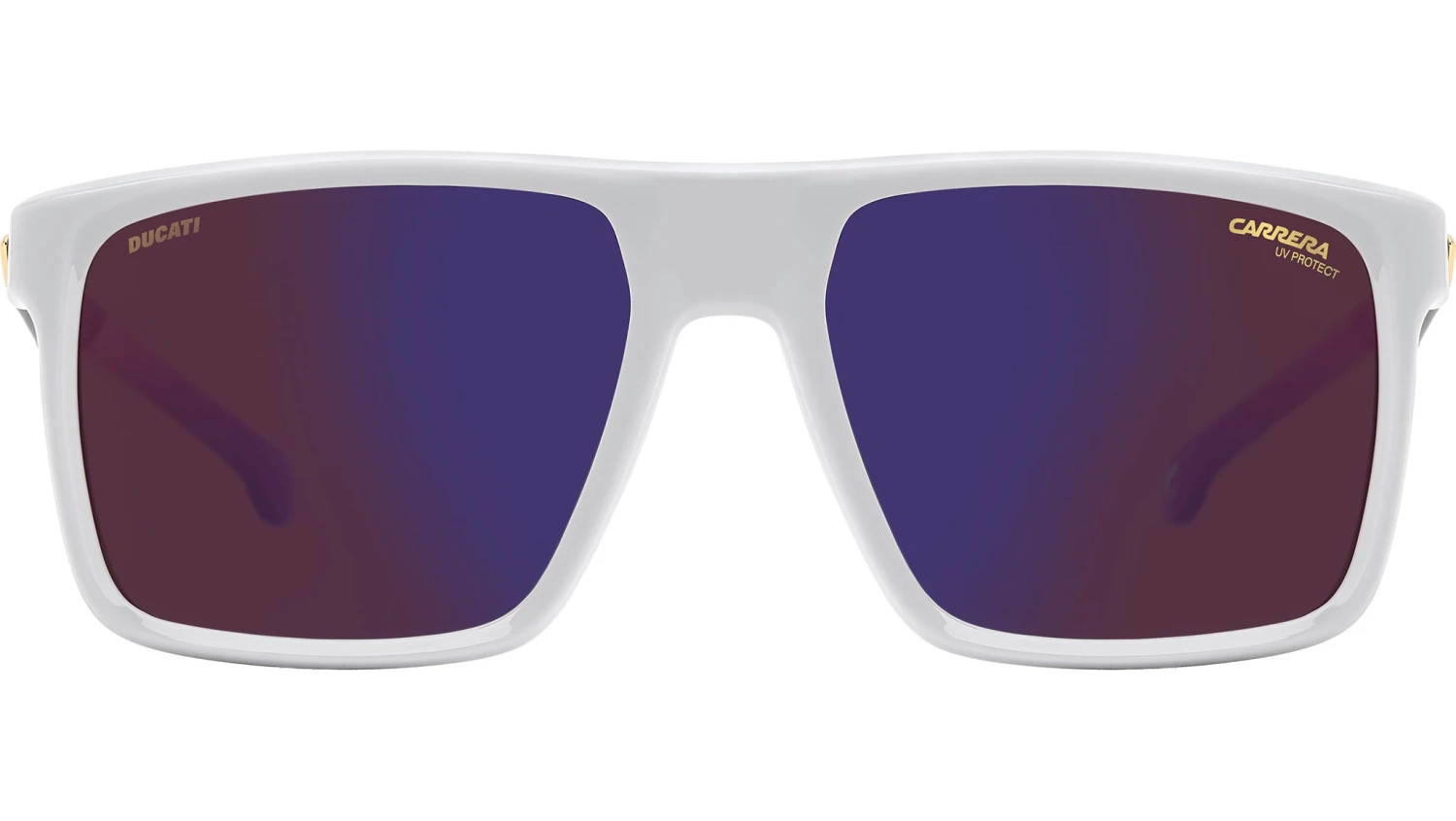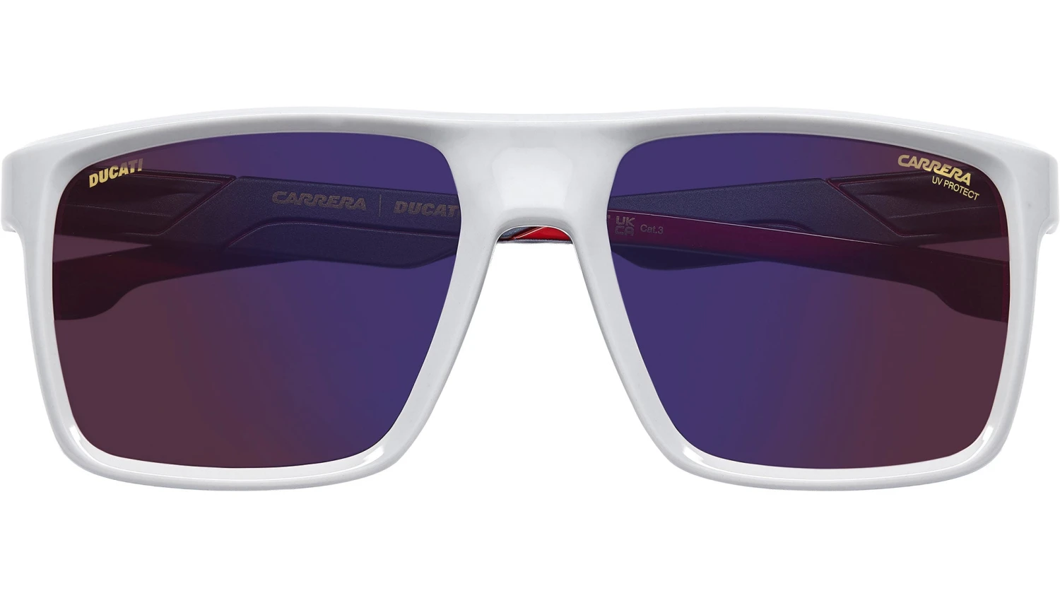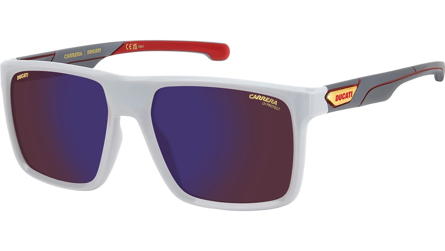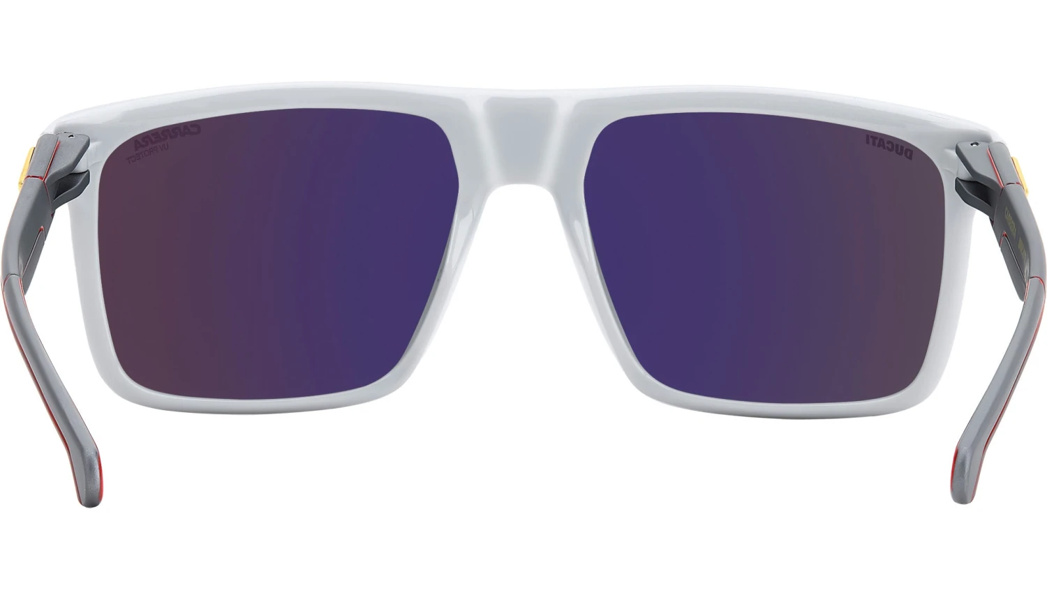 Carrera CARDUC 049/S 268 Z0 sunglasses for men, featuring grey red rectangular nylon frame and blue multilayer lenses. Leading the pack when it comes to style is easy with these Carrera | Ducati sunglasses. Their character comes from their multifaceted structure. The temples are key: they reference Ducati motorcycle design and feature a metal insert trimmed by logo, even more fearless in the versions with a pop of colour. This style is available in mirrored or photochromic lens versions. Brand line: Paddock. Style code: 207874. Color code: 268 Z0. Authorized Carrera online reseller. Your glasses will include the original case and accessories and are covered by a 12-month global warranty.
