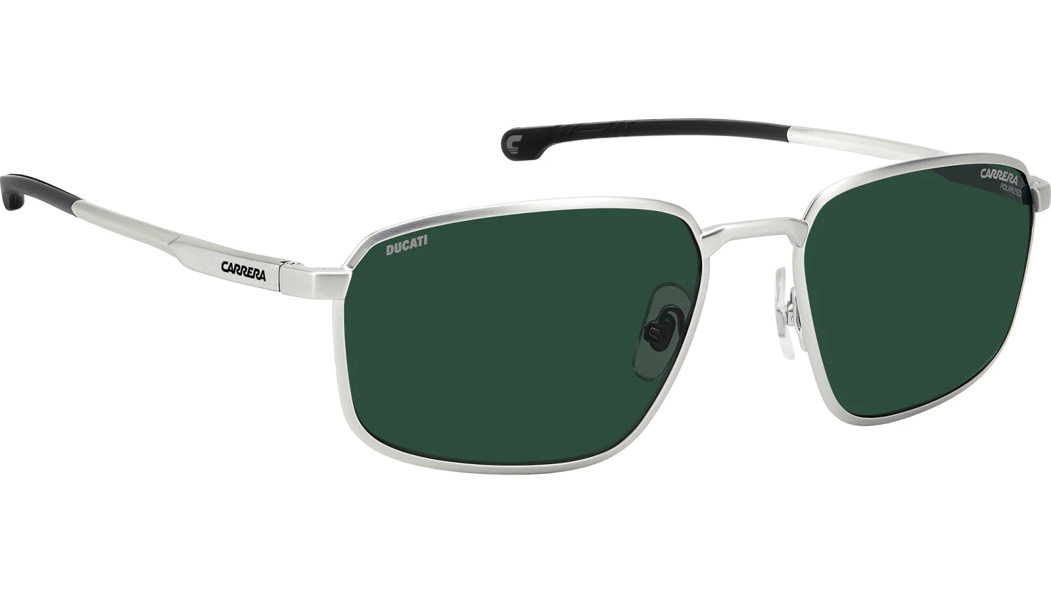 Carrera CARDUC 052/S 62L UC sunglasses for men, featuring brushed palladium rectangular metal frame and green polarized lenses. Carrera | Ducati sunglasses are the stars of the racetrack and the grandstands. With extremely versatile slim profiles and a rectangular silhouette, this style goes effortlessly with casual outfits or can be worn with formal ensembles for a more daring look. The temples are in aluminium, a first-choice high-performance material when it comes to athletic eyewear. Adjustable nose pads further increase the level of comfort, as do the flexible hinges and the option to fit the frames with prescription sun lenses. These glasses are available in versions with polarized or ultrapolar lenses. Brand line: Elegante. Style code: 207877. Color code: 62L UC. Authorized Carrera online reseller. Your glasses will include the original case and accessories and are covered by a 12-month global warranty.