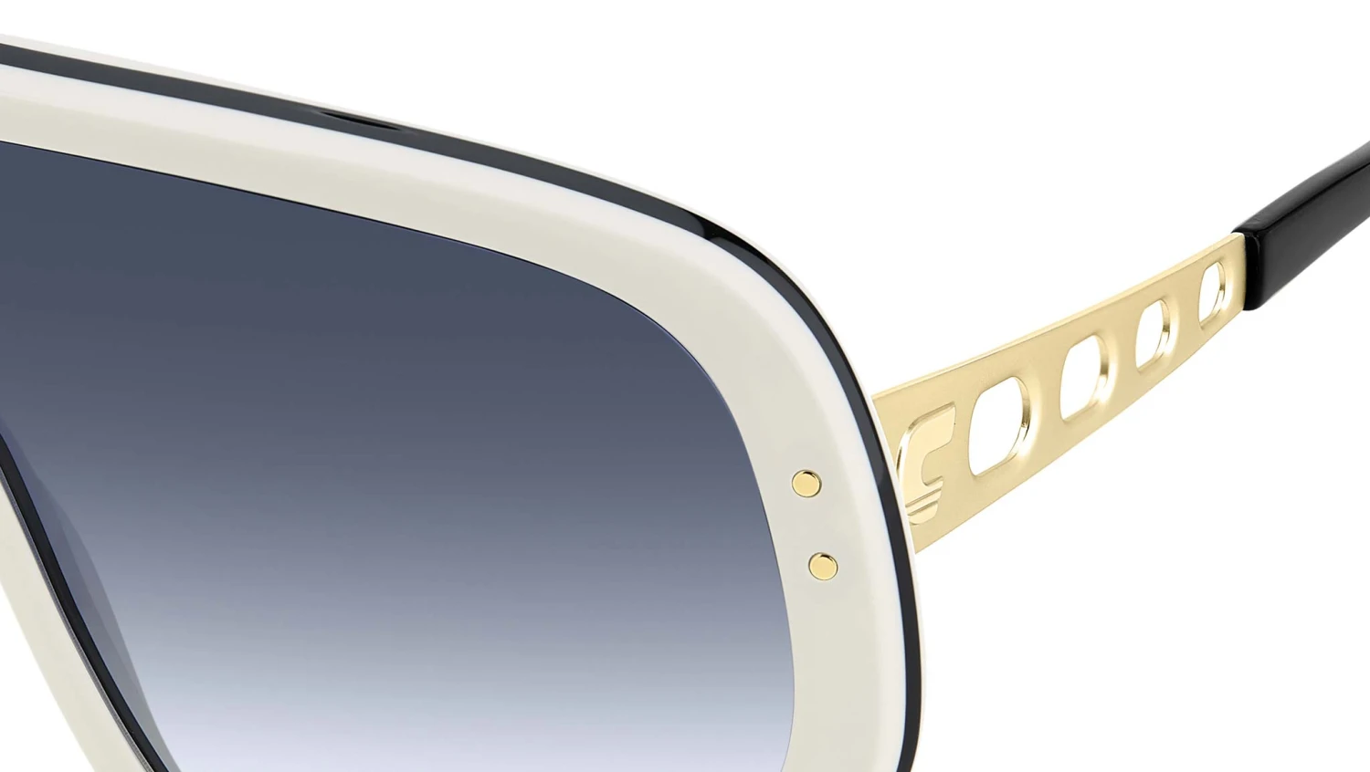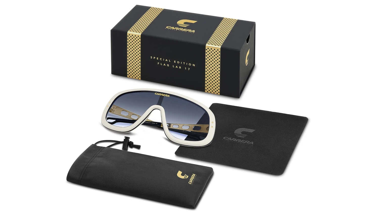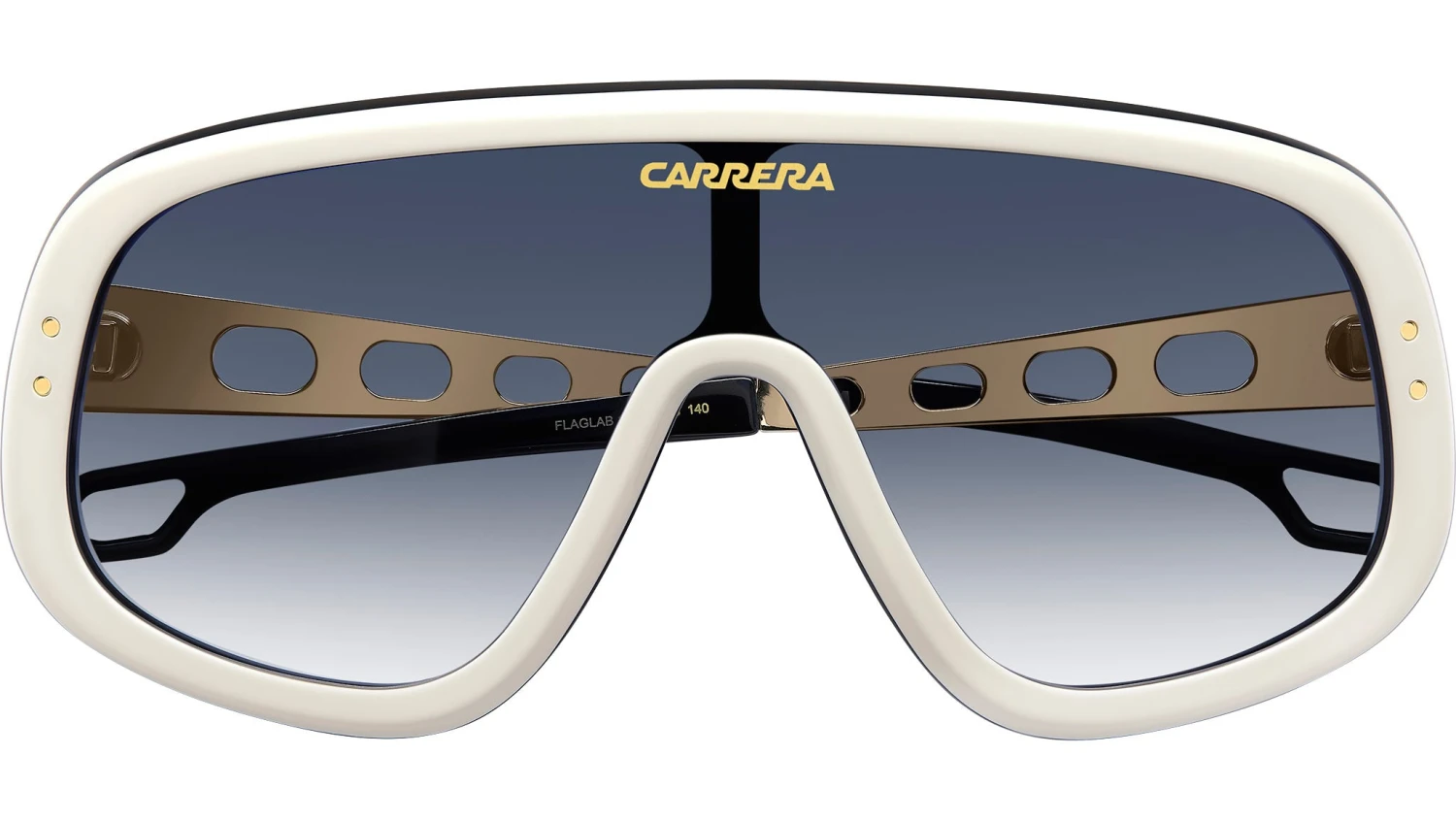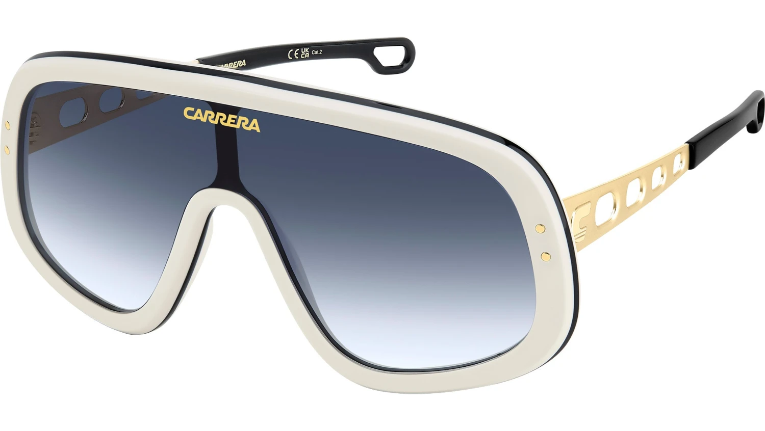 Carrera FLAGLAB 17 B4E 08 sunglasses for men, featuring white gold shield acetate frame and dk blue shaded lenses. These Carrera sunglasses bring a sporty attitude to fashion. The shield front is profiled by acetate, printed with a logo on the lens. The temples are a true gem: their round vents echo the design of the steering wheels on the classic cars which raced in the Carrera Panamericana. Versions with yellow or orange lenses give rise to a truly evocative look. This collector’s item comes with its own special packaging. Brand line: Flag. Style code: 207556. Color code: B4E 08. Authorized Carrera online reseller. Your glasses will include the original case and accessories and are covered by a 12-month global warranty.