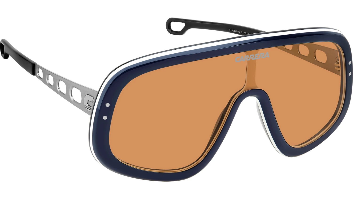 Carrera FLAGLAB 17 DTY W7 sunglasses for men, featuring blue ruthenium shield acetate frame and orange lenses. These Carrera sunglasses bring a sporty attitude to fashion. The shield front is profiled by acetate, printed with a logo on the lens. The temples are a true gem: their round vents echo the design of the steering wheels on the classic cars which raced in the Carrera Panamericana. Versions with yellow or orange lenses give rise to a truly evocative look. This collector’s item comes with its own special packaging. Brand line: Flag. Style code: 207556. Color code: DTY W7. Authorized Carrera online reseller. Your glasses will include the original case and accessories and are covered by a 12-month global warranty.