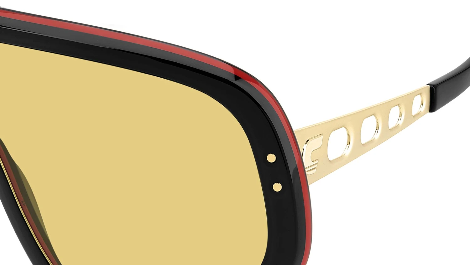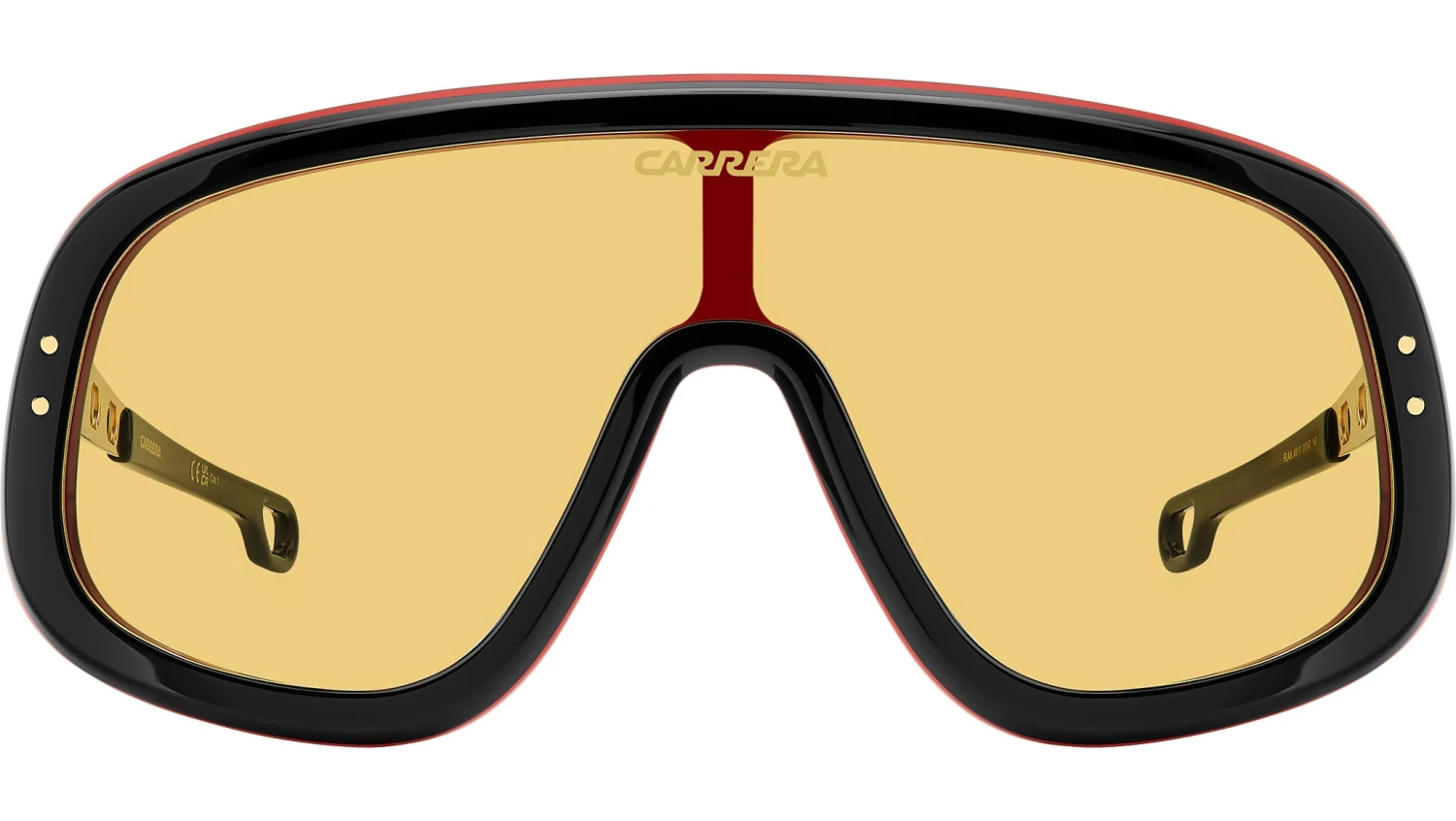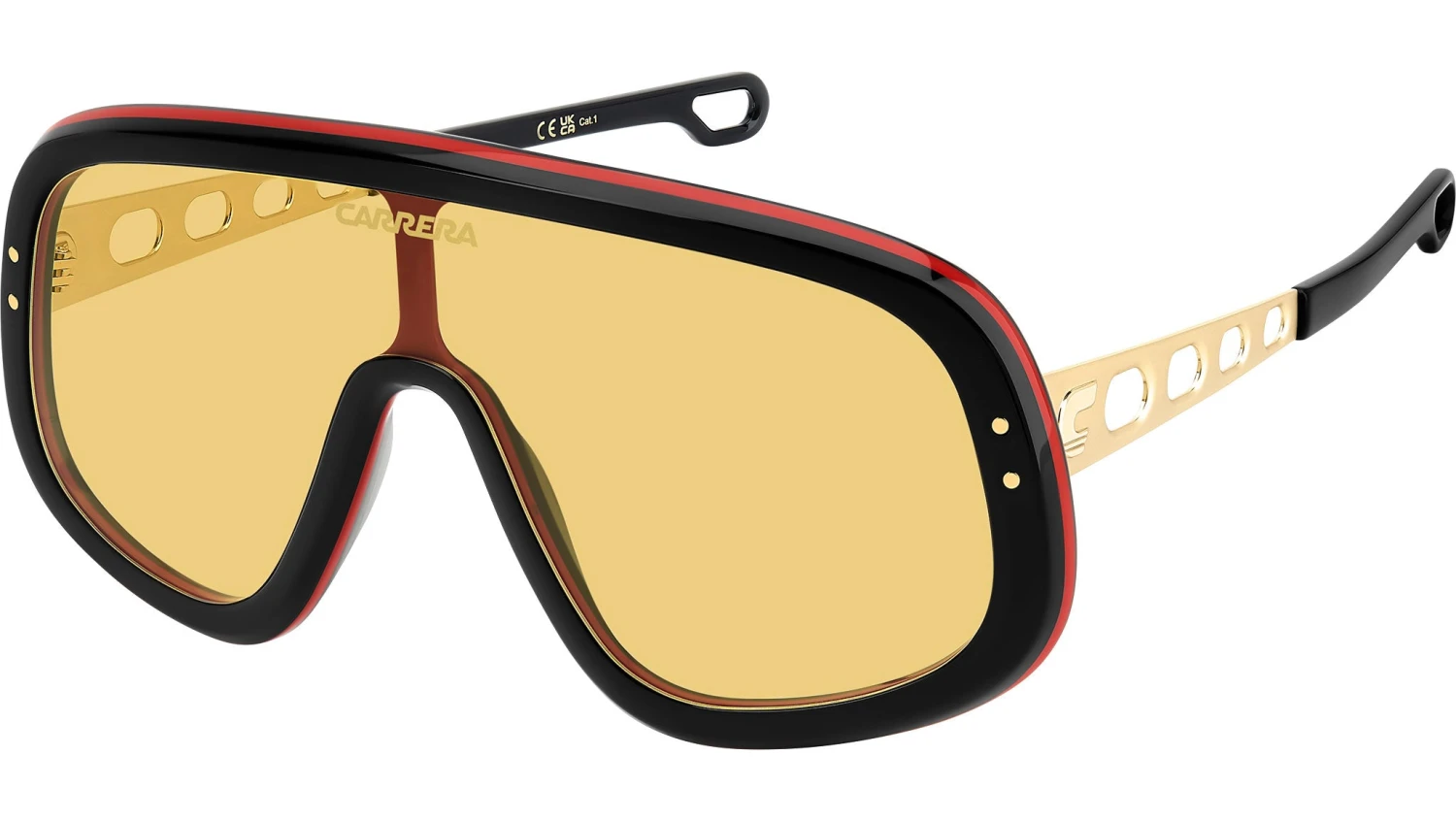 Carrera FLAGLAB 17 OIT HO sunglasses for men, featuring black red shield acetate frame and yellow lenses. These Carrera sunglasses bring a sporty attitude to fashion. The shield front is profiled by acetate, printed with a logo on the lens. The temples are a true gem: their round vents echo the design of the steering wheels on the classic cars which raced in the Carrera Panamericana. Versions with yellow or orange lenses give rise to a truly evocative look. This collector’s item comes with its own special packaging. Brand line: Flag. Style code: 207556. Color code: OIT HO. Authorized Carrera online reseller. Your glasses will include the original case and accessories and are covered by a 12-month global warranty.