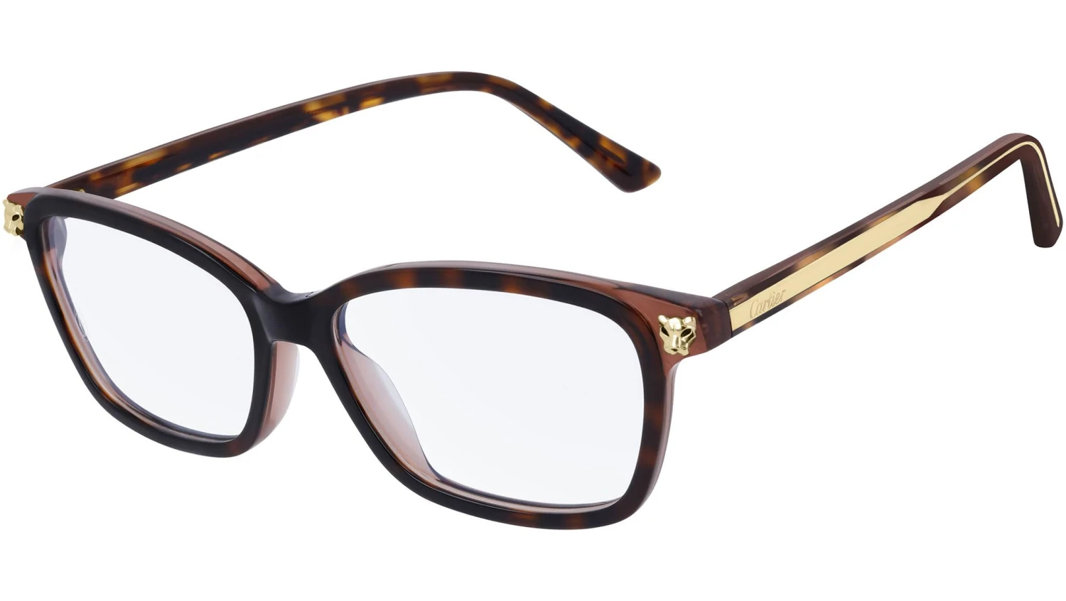 Cartier Contemporary optical collection model CT0206O 002 featuring shiny bilayer dark havana / transparent brown frame and havana temple.