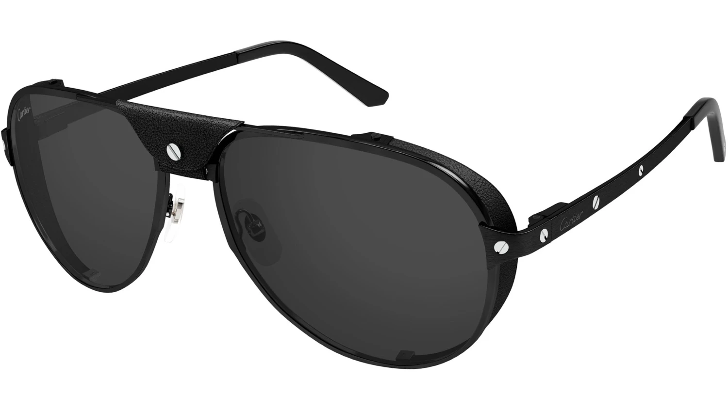 Cartier CT0296S 003 sunglasses for men, featuring smooth and brushed black pvd finish with black leather nose pilot metal frame and ultra black polarized CR-39 lenses. Brand line: Exception. Style code: CT0296S. Color code: 003. Made in Italy. Authorized Cartier online reseller. Your glasses will include the original case and accessories and are covered by a 12-month global warranty.