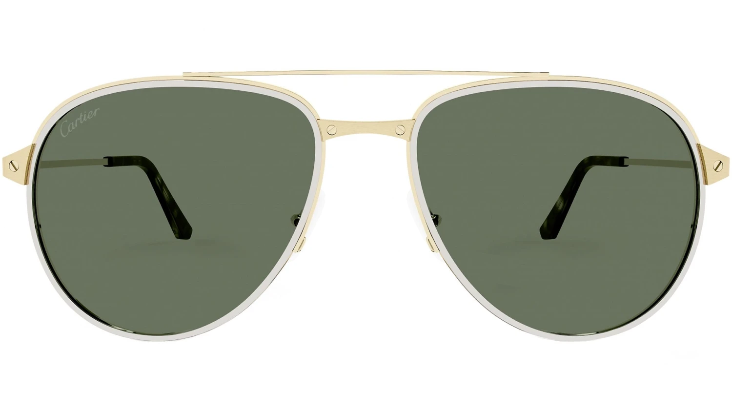 Cartier 0325S 006 sunglasses with smooth and brushed golden finish frame and smooth platinum finish eyerims frame and green lens.