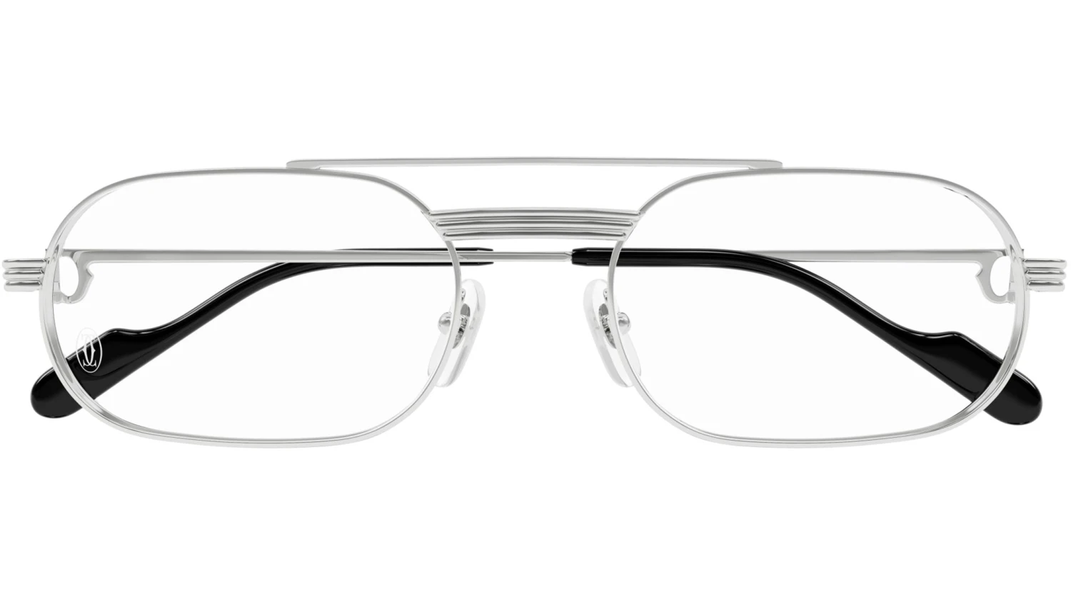 Cartier Exception optical collection model CT0410O 002 featuring smooth platinum finish frame and silver temple.