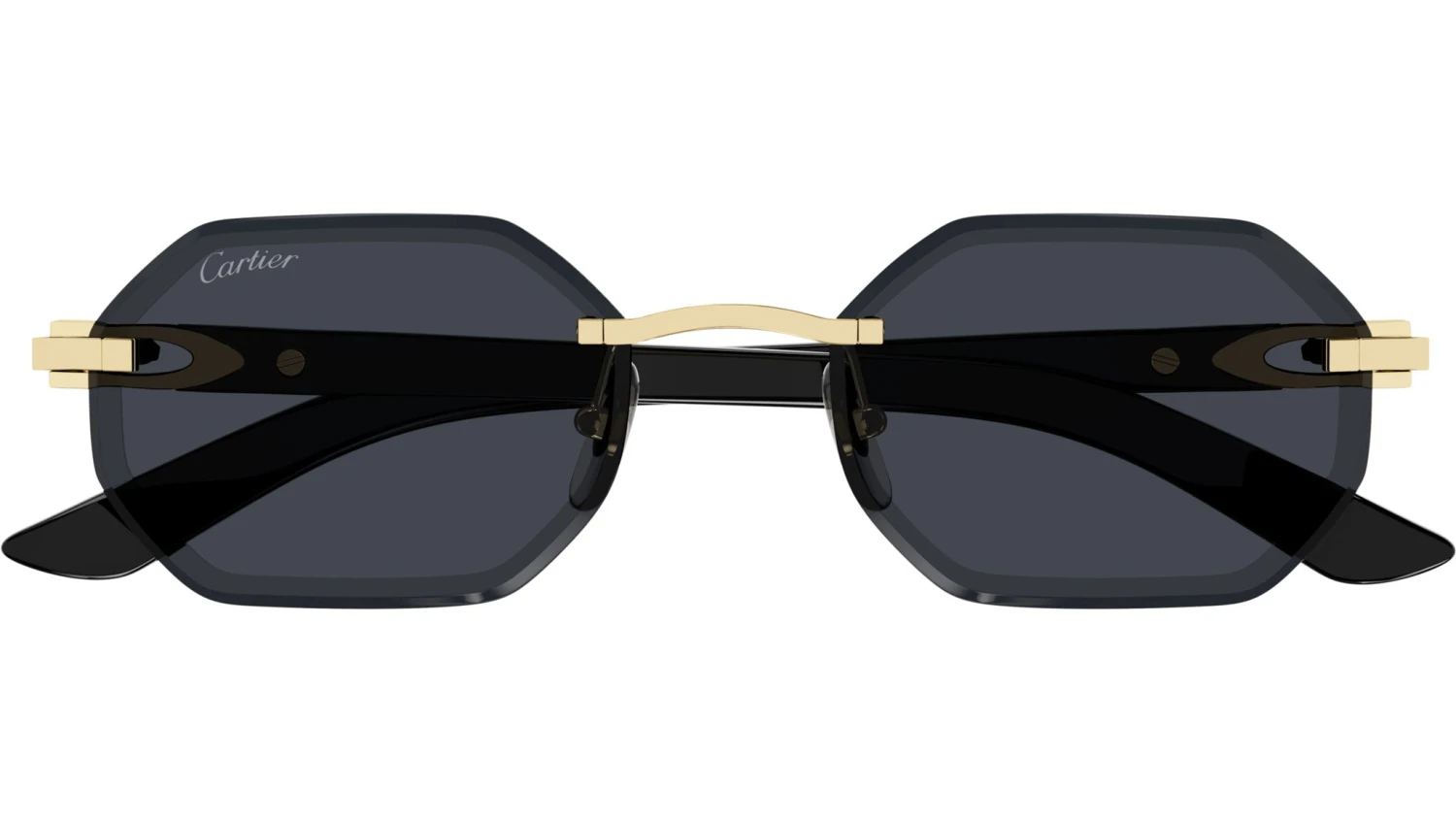 Cartier Exception sunglasses model CT0439S geometric metal frame color code 002 smooth golden finish with white temple and grey lens.
