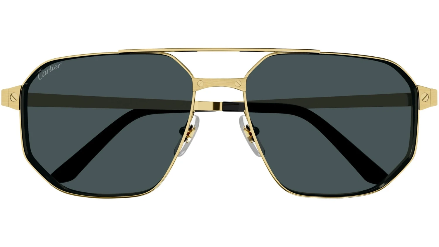Cartier Core Range sunglasses model CT0462S aviator metal frame color code 003 smooth brushed golden finish with gold temple and green polarized lens.
