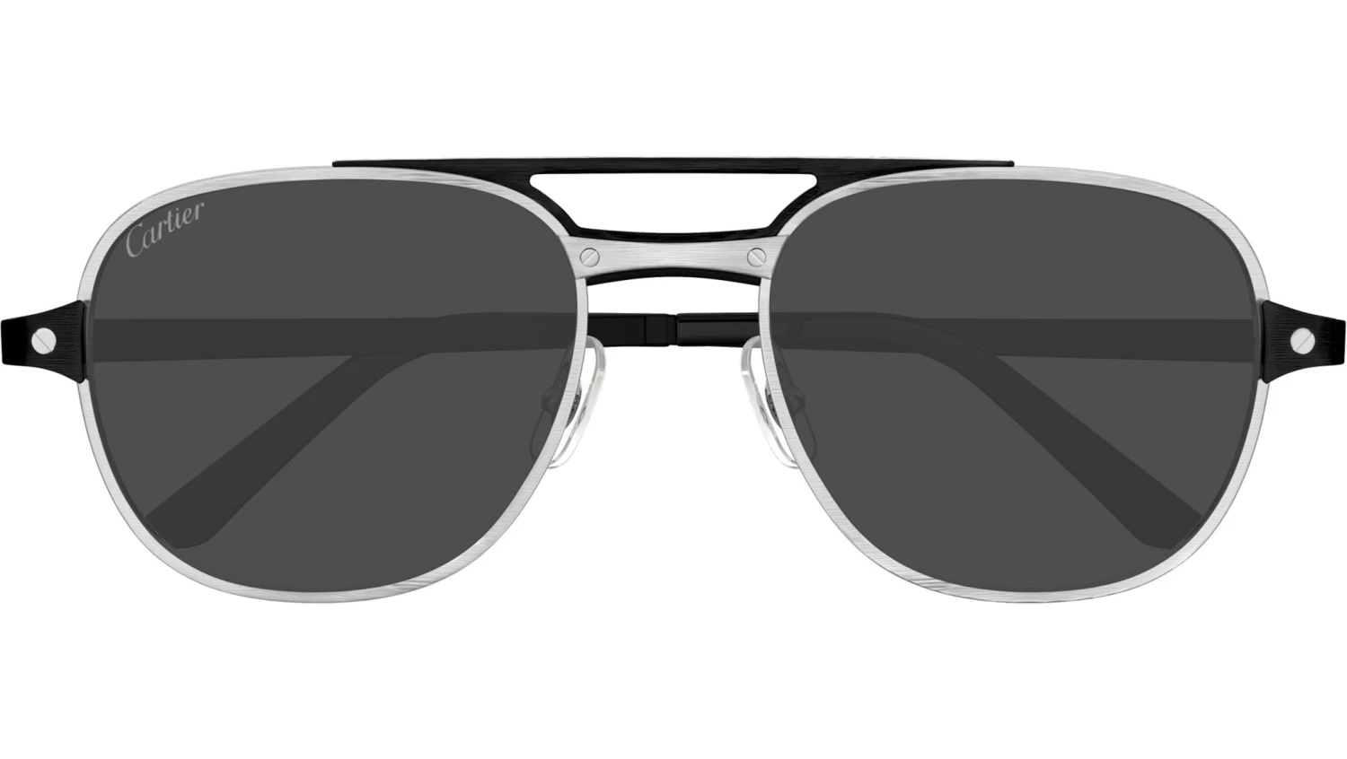 Cartier Exception sunglasses model CT0477S aviator metal frame color code 001 brushed platinum finish and brushed with black temple and black polarized lens.