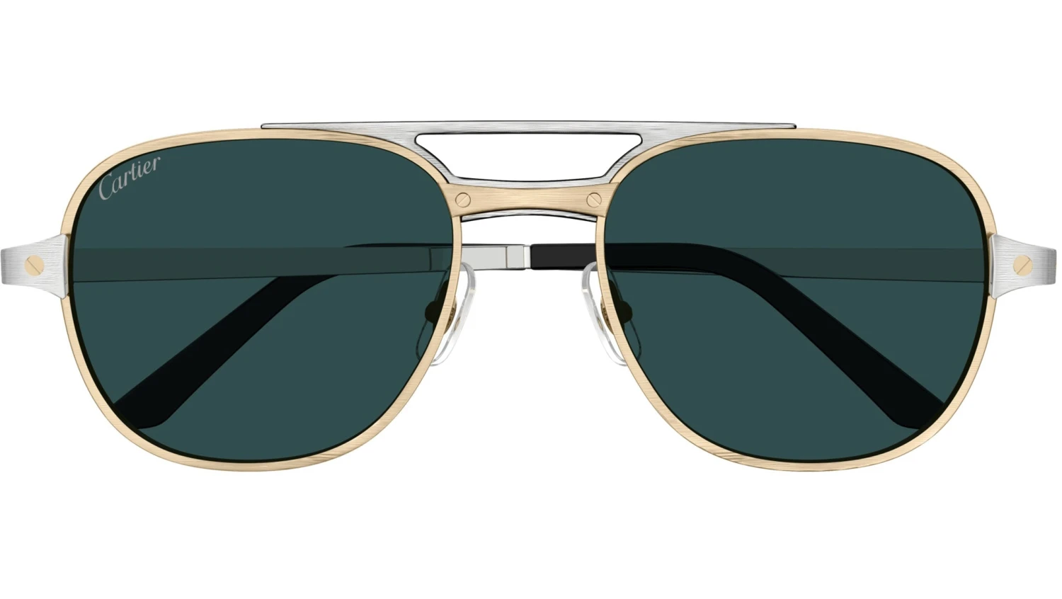 Cartier Exception sunglasses model CT0477S aviator metal frame color code 003 brushed golden finish and brushed platinum finish with silver temple and green polarized lens.