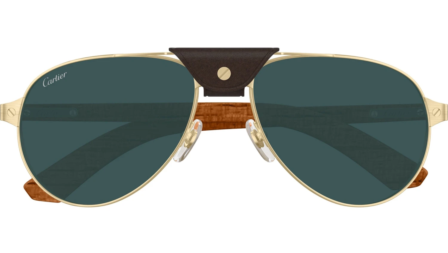 Cartier Exception sunglasses model CT0495S aviator metal frame color code 002 smooth and brushed golden finish with brown temple and green polarized lens.