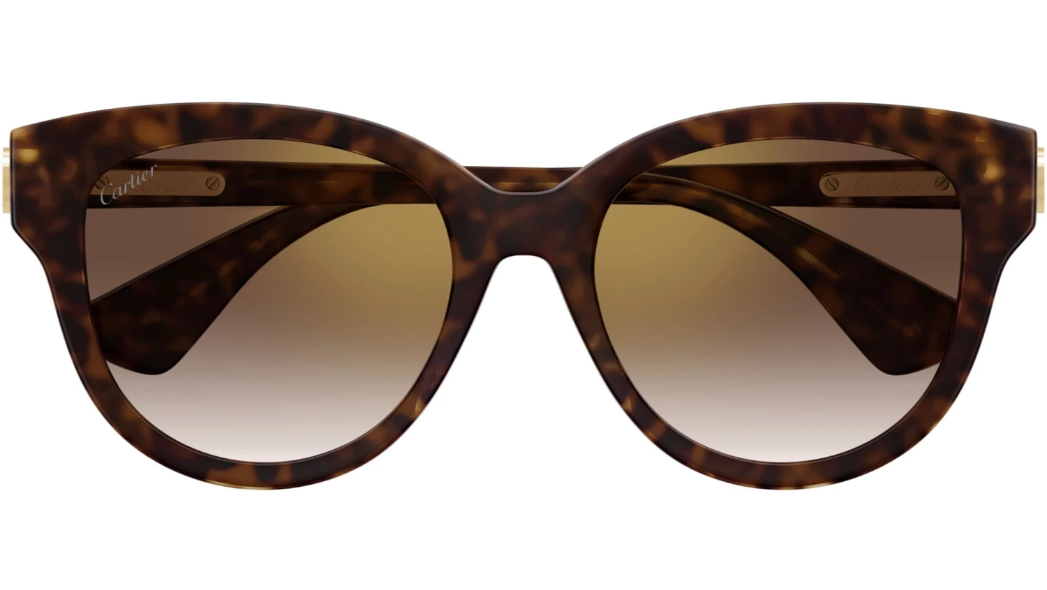 Cartier Contemporary sunglasses model CT0506S panthos recycled acetate frame color code 002 dark tortoiseshell effect with havana temple and graded brown with a golden flash lens.
