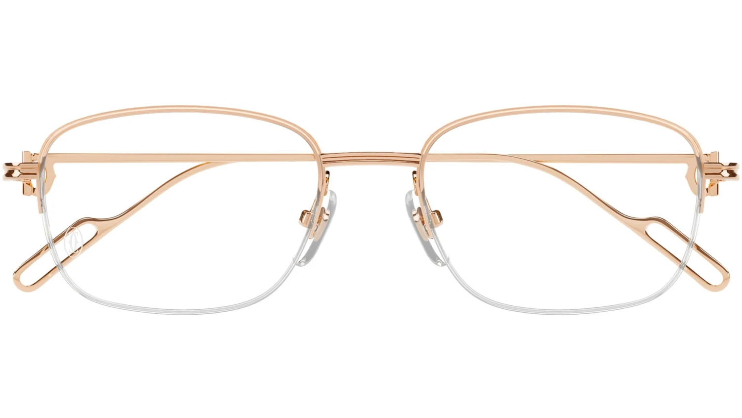 Cartier Precious eyewear model CT0529OA rectangle gold glasses color code 001 rose solid gold with copper temple and recycled demo lens with hard coating and AR blue out.