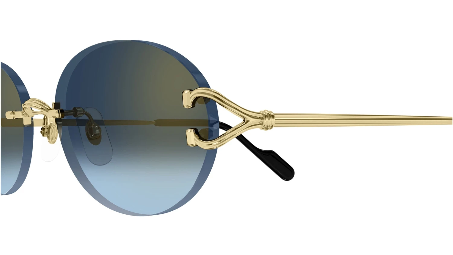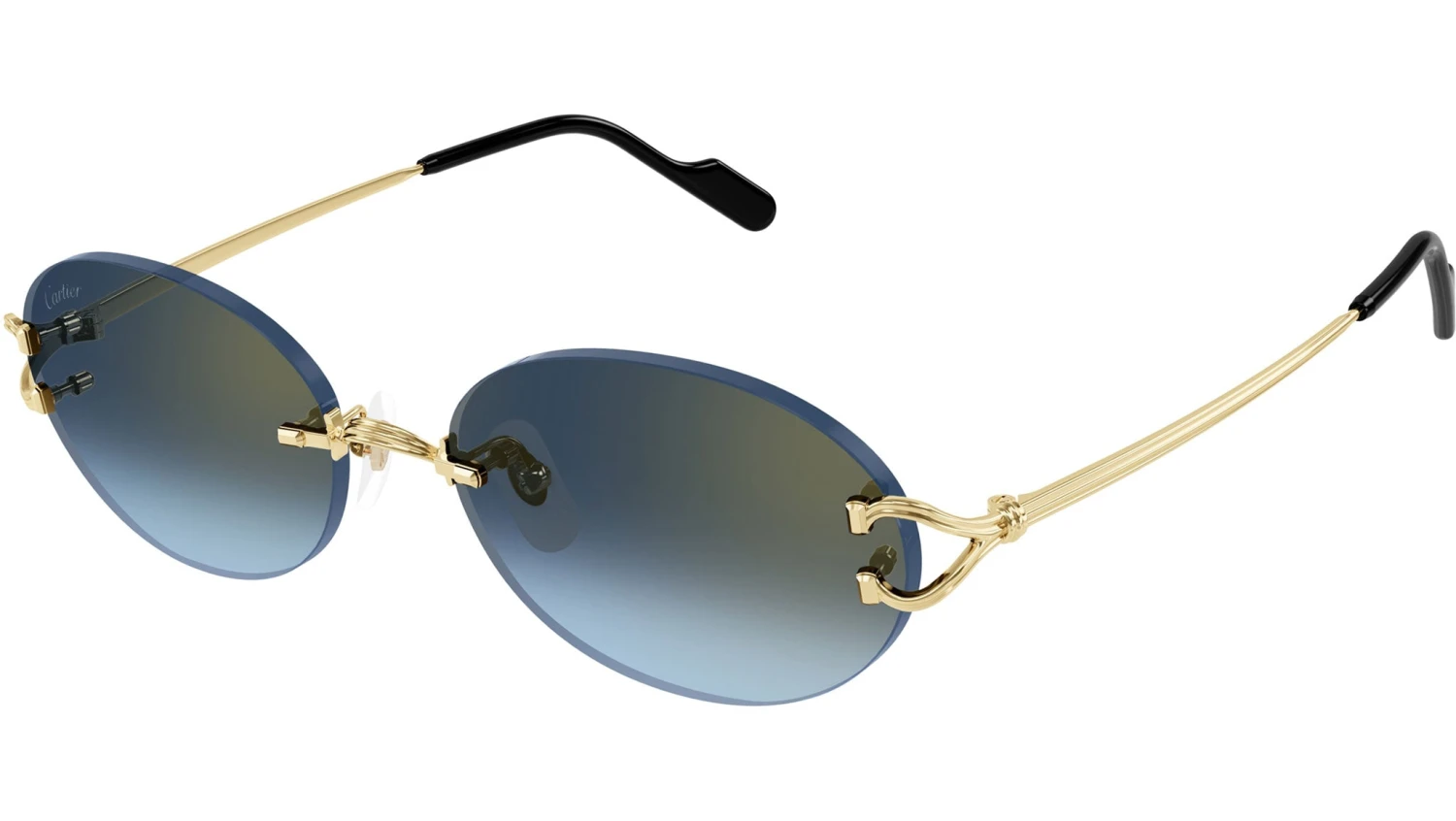 Cartier CT0551S 002 sunglasses for men and woman, featuring smooth golden finish oval metal frame and graded blue and azure with a golden flash nylon lenses. Brand line: Core Range. Style code: CT0551S. Color code: 002. Made in France. Authorized Cartier online reseller. Your glasses will include the original case and accessories and are covered by a 12-month global warranty.