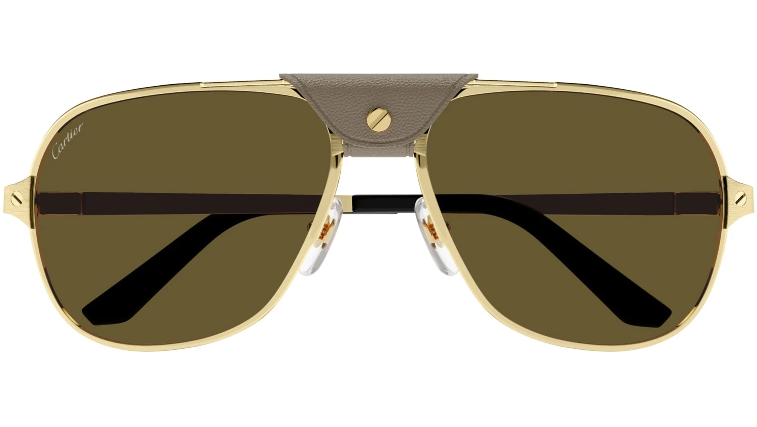Cartier Core Range sunglasses model CT0165S aviator metal frame color code 011 brushed smooth golden finish / sepia leather with gold temple and brown polarized lens.