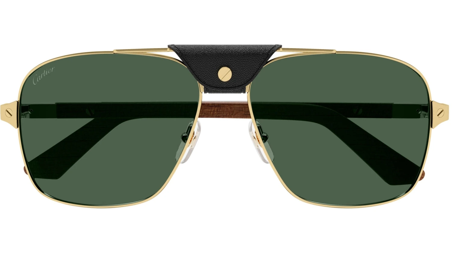 Cartier Exception sunglasses collection model CT0389S 002 featuring smooth golden finish frame and green polarized lens.